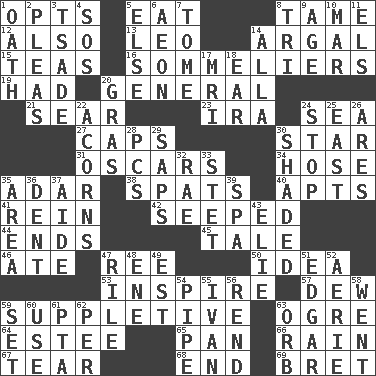 ACROSS 1. Chooses 5. Consume 8. Docile 12. In addition 13. Lion 14. Therefore, facetiously 15. Beverages made from leaves 16. Wine waiters 19. Possessed 20. Commissioned military rank 21. Burn superficially 23. Lyricist Gershwin 24. Ocean 27. Balmoral and tarboosh 30. Play the lead 31. Motion picture awards 34. Flexible conduit 35. The sixth month of the Jewish calendar 38. Arguments over trivial matters 40. Tenement units (abbr.) 41. It's straight from the horse's mouth 42. Oozed 44. Conclusions 45. Story 46. Had dinner 47. To sift 50. The main thing one is thinking about 53. Heighten or intensify 57. Morning condensation 59. Supplying deficiencies 63. Legendary monster 64. First name in cosmetics 65. Baking dish 66. Water falling in drops from the sky 67. Pull into pieces 68. Conclusion 69. Cy Young winner Saberhagen DOWN 1. Pledge 2. Entreaties 3. Sadhe (variant) 4. Mayday 5. Otherwise 6. Period of immesurable duration 7. Heavy book 8. Three (prefix) 9. Personal question 10. Impair 11. Raised railways 14. Silent film actress Nazimova 17. Medical imaging device (abbr.) 18. Ewer handle 20. Pate de foie ____ 22. Oak nuts 24. Obstruct or block passage 25. 90 degrees 26. Ancient Greek god of war 28. Personal Computers (abbr.) 29. Plant excrements 30. Cast a shadow over 32. Actress Charlotte 33. Proofreading order 35. Type of rug 36. Gouge 37. Helper 39. Health resort 43. Writer Wiesel 47. Cause heat under the collar 48. Compass dir. 49. Eastern Standard Time (abbr.) 51. _ Allan Poe 52. Nest on high 54. Corncob 55. "Terrible" tsar 56. Tear apart 58. Gone 59. Put into a specified state 60. Purpose 61. Parent Teacher Association (abbr.) 62. For each 63. Globe