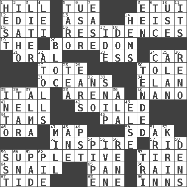 ACROSS 1. Land elevation 5. Third day of the wk. 8. Needle holder 12. Singer Brickell 13. White ___ sheet 14. Robbery 15. Suttee (variant) 16. Dwellings 19. Definite Article 20. Mood resulting from idleness 21. Spoken 23. Double-curved letter 24. 4-wheeled motor vehicle 27. Carry 30. Lacquered or enameled metalware 31. Seas 34. Liveliness 35. Slanted text style (abbr.) 38. Sports stadium 40. Billionth: prefix 41. 1994 drama film starring Jodie Foster 42. Dirtied 44. Scottish caps 45. Diluted with white 46. Mouth or opening 47. Atlas unit 50. Neighbor of Neb. 53. Stimulate to action 57. To free from 59. Supplementary 63. Hoop that covers a wheel 64. Slow-paced one 65. Baking dish 66. Precipitation 67. Periodic rise and fall of the sea level 68. Compass dir. 69. Taverns DOWN 1. Command 2. Potato state 3. 61 cubic inches 4. Luau accessory 5. Pacific island yam 6. One who makes use of a thing 7. Relaxation 8. Car or cant ending 9. Nervous spasm 10. Purpose 11. ___ a Wonderful Life 14. Folds over and sews together 17. Binary compound 18. Two (Sp.) 20. Coalition 22. Ringlike coral islands and reefs 24. Root beer relative 25. Actor Alda or Thicke 26. Western Nevada city 28. Beverage made from leaves 29. Hearing organs 30. Watched over 32. Modern: prefix 33. Clip 35. To the inside or interior of 36. Rend 37. _ mater 39. Wing 43. Otherwise 47. Place where flour is made 48. One (Scot) 49. Pacific Standard Time (abbr.) 51. Believer in; advocate of (suffix) 52. Japanese brewing company 54. Corncob 55. _ the terrible 56. French philosopher Descartes 58. Lairs 59. Fast jet (abbr.) 60. University (slang) 61. Writing tablet 62. Sliced dessert 63. Three (prefix)