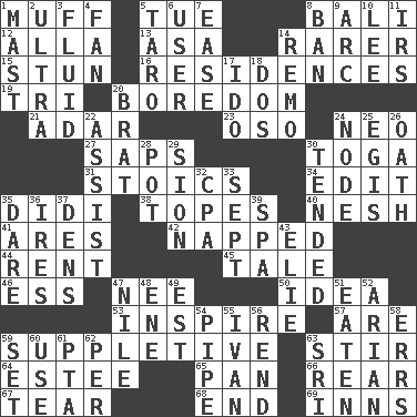 ACROSS 1. Perform or handle clumsily 5. Third day of the wk. 8. Indonesian resort city 12. Silent film actress Nazimova 13. White ___ sheet 14. Less widely known 15. Make senseless or dizzy 16. Dwellings 19. Three (prefix) 20. Mood resulting from idleness 21. The sixth month of the Jewish calendar 23. Bear (Spanish) 24. Modern: prefix 27. Plant excrements 30. Ancient Roman robe 31. Unemotional ones 34. Prepare for publication 35. "You Light Up My Life" star Conn 38. Drinks excessively 40. Delicate 41. Ancient Greek god of war 42. Slept 44. Monthly bill 45. Story 46. Curvy letter 47. Born 50. The main thing one is thinking about 53. Heighten or intensify 57. "We ___ not amused" (Victoria) 59. Supplying deficiencies 63. Agitate 64. First name in cosmetics 65. Baking dish 66. Bring up, as a child 67. Pull into pieces 68. Conclusion 69. Restaurants DOWN 1. Vertical spar for supporting sails 2. Extreme 3. Watery 4. Air blower 5. Pacific island yam 6. One who makes use of a thing 7. Comfort 8. Forbid 9. Curve 10. Area sheltered from the wind 11. Big collection agency 14. San ____ (Riviera town) 17. Wedding promise 18. Two (Sp.) 20. Naughty child 22. Help 24. Thickened enlargement 25. The front part of a cuirass 26. Pledge 28. Plant holder 29. The Jewish people; Israel 30. Watched over 32. Numbers guy (abbr.) 33. Back-to-school mo. 35. Have the gumption 36. Angers 37. Lairs 39. Health resort 43. Writer Wiesel 47. "Death on the ____" 48. Compass dir. 49. Eastern Standard Time (abbr.) 51. Eroded 52. Believer in; advocate of (suffix) 54. Corncob 55. "Terrible" tsar 56. Tear apart 58. Blunders 59. Arrange properly for use 60. Purpose 61. Parent Teacher Assoc. 62. For each 63. _ Lanka