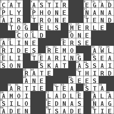 ACROSS 1. Feline 4. Having gotten out of bed 9. Mild oath 13. Strand of rope, yarn or thread 14. Give a jingle 15. Grandmother 16. Wind 17. Marketplace scale 18. Look after 19. Coat; cloak 21. Raised railways 22. Haggard of country music 24. Having a low temperature 26. Single 27. Place in a line 29. Celtic language 30. Amusement-park features 31. San ____ (Riviera town) 33. Leather borer 36. Connecticut Ivy Leaguer 37. Lacerating 40. Ocean 41. Boy, to dad 42. Three-handed card game 43. Slender Brazilian palm 45. Assign a rank or rating to 47. One of three equal parts 48. One (Scot) 49. Observes 50. Nick name for Arthur 52. Beverage made from leaves 54. R.R. building 56. Mine, in Marseilles 57. Dipping utensil 59. Chicken ___ king 61. Grain storage tower 62. Ferber et al. 63. Tired old horse 64. Arabian gulf 65. Sadhe (variant) 66. Make a knot DOWN 1. Numbers guy (abbr.) 2. Set down 3. Polypeptide antibiotic 4. Fitting 5. Tear up 6. Instrument 7. Lodging establishments 8. Portuguese money of account (variant) 9. Main course 10. Highlander 11. Singer Murray 12. June honoree 20. Went 22. Person of subnormal intelligence 23. Followers of ems 25. For fear that 27. Ancient Greek god of war 28. _ and Stitch 29. Give off 31. Libertine 32. Epoch 33. Helper 34. Erode 35. Put down 38. First name in cosmetics 39. Yard entry 44. "______ My Girl" (Turtles hit) 45. Food allowance for one day 46. Cuckoo 49. First course 50. Among 51. Hero or heavy, e.g. 52. Small amounts or degrees 53. Pulitzer Prize-winning author Ferber 55. Jai ____ 56. White ___ sheet 57. Allow 58. Compass dir. 60. Mature