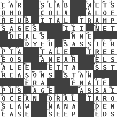 ACROSS 1. Ewer handle 4. Broad, flat, thick piece 8. Moistens 12. 17th letter of the Greek alphabet 13. Root beer relative 14. Medicinal plant 15. Reuben's nickname 17. Slanted text style (abbr.) 18. _____ steamer (cargo ship) 19. Gurus 21. One more than two 23. Remaining after all deductions 24. Allots cards 26. Compass dir. 28. Colored 30. More disrespectful 34. Parent Teacher Assoc. 37. Lie 39. Relationship diagram 40. Greek goddess of the dawn 41. Approach 43. Raised railways 44. Toward shelter 46. Singer James 47. Fast jet (abbr.) 48. Thinks logically 51. Comedian Laurel of Laurel & Hardy 54. Period 55. Related on the mother's side 58. Product of festering 61. Ripen 63. Slender Brazilian palm 65. Sea 67. Of the mouth 71. Pacific island yam 72. Cole _ (cabbage dish) 73. Grandmother 74. Lair 75. Comfort 76. Ooze 77. Begley and Asner DOWN 1. Blunders 2. Having the leading position 3. Makeup applied to the cheeks 4. _-fi 5. Car dealer's back yard 6. Chicken ___ king 7. Indonesian resort city 8. Armed conflict 9. Liveliness 10. Heavy book 11. Back-to-school mo. 16. Necklace unit 18. Canisters 20. Secret 22. _ tizzy (2 wds.) 25. Stalk of a moss capsule 27. Eastern Standard Time (abbr.) 29. Natives or inhabitants of Denmark 30. Theater features 31. Angers 32. Snakelike fish 33. State of inaction 34. Lightbulb-shaped fruit 35. Lacquered or enameled metalware 36. Toward the sea 38. Allow 42. Pace 45. Compass dir. 49. NW Algerian seaport 50. Tired old horse 52. Santa ___, CA 53. Political cartoonist Thomas 56. Sadhe (variant) 57. Having ears or earlike features 58. Introduce or present, as a question 59. Southern CA. univ. 60. Oceans 62. Immeasurably long periods of time 64. Charged particles 66. Deep reverence 68. Actress Charlotte 69. A saturated hydrocarbon 70. Pet locale