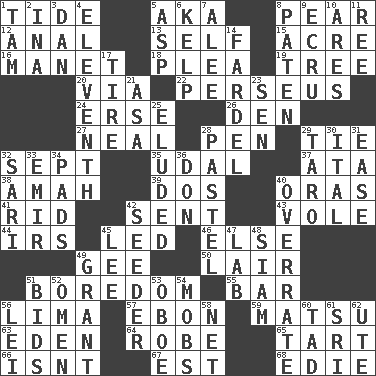 ACROSS 1. Periodic rise and fall of the sea level 5. Alias (abbr.) 8. Lightbulb-shaped fruit 12. Of or related to the anus 13. Automatic 15. Land measure 16. French painter Edouard 18. Entreaty 19. Family _ (genealogy) 20. By way of 22. Son of Zeus who helped slay Medusa 24. Celtic language 26. Lair 27. Actress Patricia 28. Fenced enclosure 29. Make a knot 32. Back-to-school mo. 35. Hereditary estate 37. _ moment's notice (2 wds.) 38. Nanny 39. Two (Sp.) 40. Mouths or openings 41. To free from 42. Posted 43. Grand slam 44. Big collection agency 45. Directed 46. Otherwise 49. Unit of force equal to gravity 50. Den 51. Mood resulting from idleness 55. Long, evenly shaped piece 56. Pale green bean 57. Inky black, to poets 59. Taiwanese island in East China Sea 63. Genesis locale 64. Loose flowing garment 65. Small pie 66. Is not 67. Eastern Standard Time (abbr.) 68. Singer Brickell DOWN 1. Scottish cap 2. _ tizzy (2 wds.) 3. Daniel's nick name 4. Veterans Day date 5. Viper 6. Seaweed 7. Toward shelter 8. Eucharist need 9. Shade of tan 10. Ancient Greek god of war 11. To sift 14. Pack 17. Become fatigued 21. White ___ sheet 23. Elected rep. 25. Evaded 28. Soft color 29. Pacific island yam 30. Slanted text style (abbr.) 31. Relaxation 32. Indian skirt 33. Independent ruler or chieftain 34. Groovy apts. 36. Spanish title 40. Make much ado about nothing 42. Sowing specialist 45. Area sheltered from the wind 47. Experiment locale 48. Thailand, formerly 49. Let have 51. Auction offers 52. Sign of something about to happen 53. Mitch Miller's instrument 54. Disorderly crowds 56. Flowery wreath 58. Fish or hair follower 60. Small boy 61. _ Lanka 62. Shoshoni