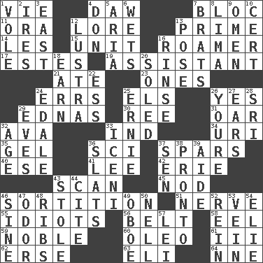 ACROSS 1. Compete 4. Obsolete 7. Coalition 11. Mouth or opening 12. Old wives' tales, e.g. 13. A-one 14. French article 15. A single undivided whole 16. Wanderer 17. _____ Park, CO 19. Helper 21. Had dinner 23. Singles 24. Blunders 25. Raised railways 26. Consenting reply 29. Ferber et al. 30. To sift 31. Rowing implement 32. Actress Gardner 33. Indiana (abbr.) 34. RI univ. 35. Set 36. _-fi 37. Practice fights 40. Compass dir. 41. Area sheltered from the wind 42. One of the Great Lakes 43. Examine minutely or intensely 45. Allow head to fall sleepily 46. Determination 51. Boldness 55. Foolish or stupid persons 56. Waist strap 58. Snakelike fish 59. Having high moral qualities 60. Butter sub 61. One more than two 62. Celtic language 63. Biblical high priest 64. Compass dir. DOWN 1. Grand slam 2. Angers 3. Compass direction 4. Spanish title 5. Operatic vocal solo 6. Moistens 7. Naughty children 8. Pale green bean 9. Presage 10. Certainty 12. A period of five years 13. Introduce or present, as a question 16. Remove soap 18. Merit 20. Having a sole or soles 22. Double-curved letter 24. Peak District village in England 25. Bert's buddy 26. You are 27. Hearing organs 28. _ Lanka 29. Nights before holidays 32. Grow older 33. Ancient Celtic tribe of eastern Britain 36. Narrow boards 37. Elected rep. 38. Right away 39. Assistant 43. Took without asking 44. Quote 46. Trig term 47. Scent 48. Chest bones 49. Mitch Miller's instrument 50. 1994 drama film starring Jodie Foster 52. It's straight from the horse's mouth 53. Distinctive style or manner 54. Writer Wiesel 57. Luau accessory