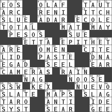 ACROSS 1. Greek goddess of the dawn 4. Norwegian king 8. Drawn tight 12. Curve 13. Painter Guido (1575-1642) 14. Hankering 15. Turn sharply 17. The sixth month of the Jewish calendar 18. Learning spot: Fr. 19. Add up to 21. Floor protector 23. Can I? 24. Mexican monetary units 26. Take to court 28. Singer James 30. Curse 34. "We ___ not amused" (Victoria) 37. Sign of something about to happen 39. Quote 40. Hat (slang) 41. Thick mixture 43. Heredity factor (abbr.) 44. Mild oath 46. Sew up the eyelids of hawks and falcons 47. Ewer handle 48. Devices for capturing images 51. Water falling in drops from the sky 54. Tired old horse 55. Trap for birds or small mammals 58. Compass dir. 61. Dry husk or covering 63. New (sp.) 65. Schedule 67. Atlas contents 71. Volcanic refuse 72. Edible starchy tuberous root 73. Opposed to 74. Binary compound 75. System (abbr.) 76. Wither 77. Turn to the right DOWN 1. Compass direction 2. Fourth or lowest deck 3. Turtle shell scale 4. Mouth or opening 5. Directed 6. Santa ___, CA 7. Securely fixed in place 8. Nervous spasm 9. Smallest unit of an element 10. Southern CA. univ. 11. Those things 16. Comfort 18. Needle holder 20. Car dealer's back yard 22. Cleo's killer 25. Constrict 27. And so on (abbr.) 29. Collect or gather 30. Keyboard key 31. Flintstone garb 32. Inactive volcano in Sicily 33. Separate forcefully 34. Actor Baldwin 35. Capital of Latvia 36. Dutch treat 38. Compass dir. 42. Liveliness 45. Lair 49. Immoral or dissolute person 50. Grow older 52. Electrically charged atom 53. Good sense 56. Former Milwaukee Brewers owner Bud 57. Elude 58. Fast planes 59. Kill 60. Armed conflicts 62. Dec. holiday 64. Double curve, resembling the letter S 66. Small child 68. One (Scot) 69. Parent Teacher Assoc. 70. Title for a knight