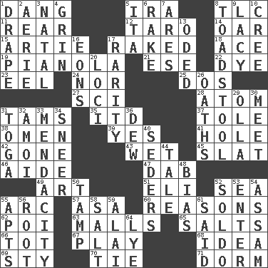 ACROSS 1. Mild oath, euphamism for damn 5. Retirement account (abbr.) 8. Affectionate concern, for short 11. Posterior 12. Edible starchy tuberous root 14. Boat paddle 15. Nick name for Arthur 17. Moved through 18. Adept person 19. Player piano 21. Compass dir. 22. Color 23. Snakelike fish 24. And not 25. Two (Sp.) 27. _-fi 28. Tiny particle 31. Scottish caps 35. It would 37. Lacquered or enameled metalware 38. Presage 39. Affirmative reply 41. Opening into or through something 42. Went 43. Dripping 45. Narrow board 46. Helper 47. Pat or tap gently 49. Tate display 51. Biblical high priest 52. Ocean 55. Curve 57. White ___ sheet 60. Thinks logically 62. Luau course 63. Shopping centers 65. Table seasonings 66. Small child 67. Shaw product 68. The main thing one is thinking about 69. Filthy place 70. Make a knot 71. Dormintory (informal) DOWN 1. Window treatment 2. Nest on high 3. Brizilian seaport 4. Broad smile 5. Call ___ day 6. Libertine 7. Ancient Greek god of war 8. Inedible or poisonous agaric 9. Made of lace 10. Algonquian 13. Wrote a lyric poem 16. Immeasurably long periods of time 17. Noteworthy scarcity 20. Locales 26. Curses 29. Water jar 30. Confront 31. Ancient Roman robe 32. Mine, in Marseilles 33. Ananias' fault 34. Contemptuous expression 36. Morning condensation 40. Spring feasts 44. Story 48. Prejudice 50. Pack (down) 52. Twentieth part of a lira 53. Keyboard key 54. Indian state 55. Flats, for short 56. Carrot, for example 58. Table seasoning 59. Mountain range southwest of Kyrgyzstan 61. Expressed in words 64. Potassium hydroxide