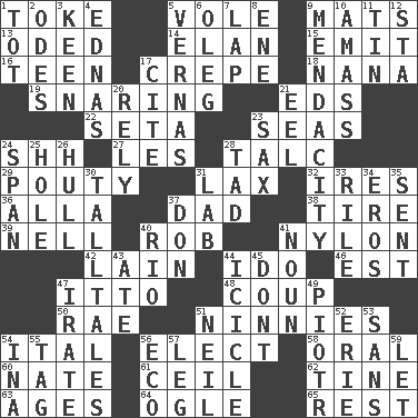 ACROSS 1. Puff or smoke 5. Short-tailed, large-bodied rat 9. Floor protectors 13. Wrote a lyric poem 14. Style 15. Give off 16. Adolescent 17. Streamer paper 18. Grandmother 19. Catching in a trap 21. Begley and Asner 22. Stalk of a moss capsule 23. Oceans 24. Quiet! 27. French article 28. Baby powder 29. Inclined to pout 31. Not strict 32. Angers 36. Silent film actress Nazimova 37. June honoree 38. Hoop that covers a wheel 39. 1994 drama film starring Jodie Foster 40. Director Reiner 41. High-strength synthetic material 42. (Had) reclined 44. Wedding promise 46. Eastern Standard Time (abbr.) 47. "Tell ____ the Marines!" 48. Overturn; upset 50. Actress Charlotte 51. Fools 54. Slanted text style (abbr.) 56. Voters do this 58. Relating to the mouth 60. Nathan's nickname 61. To provide with a ceiling 62. Prong on a fork 63. Matures 64. Stare 65. State of inaction DOWN 1. Small child 2. Lyric poems 3. Peachy ____! 4. Ferber et al. 5. Actresses Bloom and Felton 6. Cassini of fashion 7. Infant locale 8. Compass dir. 9. Ananias' fault 10. Collect or gather 11. Metal container 12. R.R. building 17. Quote 20. Trust 21. Snakelike fish 23. Saxophone 24. Connect, as a bridge 25. Hollow 26. Frame or body of a ship 28. Bit 30. Baron Munchausen's specialties 31. Experiment locale 33. Cause heat under the collar 34. Greek god of love 35. Posted 37. Spanish title 40. _ de Janeiro 41. Part of speech 43. Had dinner 44. Tapering mass of hanging ice 45. Do not 47. Feeling or showing extreme anger 49. Peter (Polish) 51. Famous astronaut Armstrong 52. 4th largest of the Great Lakes 53. Without 54. _ tizzy (2 wds.) 55. Label 56. Environmental prefix 57. Part of a journey 59. Allow