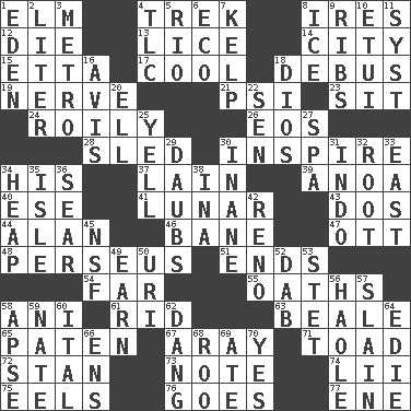 ACROSS 1. Shade tree 4. Long journey 8. Angers 12. Pass on 13. Louse (plural) 14. Municipality 15. Singer James 17. Calm and collected 18. To get out of a bus 19. Boldness 21. 23rd letter of the Greek alphabet 23. Be seated 24. Turbulent 26. Greek goddess of the dawn 28. Downhill vehicle 30. Motivate 34. Part of HMS, perhaps 37. (Had) reclined 39. Small Philippine buffalo 40. Compass dir. 41. Type of eclipse 43. Two (Sp.) 44. Actor Alda or Thicke 46. Object of repulsion 47. Baseball player Mel 48. Son of Zeus who helped slay Medusa 51. Extremities 54. At a great distance 55. Expletives 58. Cuckoo 61. To free from 63. Memphis, Tenn. Street 65. Eucharist need 67. Like ___ of sunshine 71. Frog relative 72. Comedian Laurel of Laurel & Hardy 73. Observe 74. Cards in a Roman deck? 75. Snakelike fish 76. Travels 77. Compass dir. DOWN 1. Genesis locale 2. 61 cubic inches 3. Paris' subway 4. Affectionate concern, for short 5. River (Sp.) 6. Environmental prefix 7. Seaweed 8. Frozen water 9. Teases 10. Needle holder 11. System (abbr.) 16. Advice 18. "Vaya con ____" 20. Pipe bend 22. Elected rep. 25. Shout 27. Health resort 29. Applies to a surface 30. Lacking in sense or substance 31. _ china 32. Carrot, for example 33. Compass direction 34. Pile 35. Small island 36. Shrivel 38. _ tizzy (2 wds.) 42. Western Nevada city 45. Overdraft (abbr.) 49. Merit 50. RI univ. 52. Small moist lump or mass 53. Proofreading order 56. White Person, in Hawaii 57. Killed 58. Domed church section 59. Nathan's nickname 60. Slanted text style (abbr.) 62. Mild oath, euphamism for damn 64. Singer Brickell 66. Followers of ems 68. Friend of Pooh 69. Had dinner 70. It is so