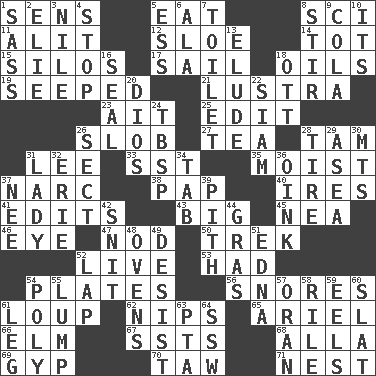 ACROSS 1. Elected reps. 5. Consume 8. _-fi 11. Set down 12. _ gin 14. Small child 15. Grain storage towers 17. Travel by water 18. Petroleums 19. Oozed 21. A period of five years 23. Small island 25. Prepare for publication 26. Messy guy 27. Afternoon social gathering 28. Scottish cap 31. Area sheltered from the wind 33. Fast jet (abbr.) 35. Damp 37. Drug cop 38. Infant food 40. Angers 41. Prepares for publication 43. Massive 45. Teachers' org. 46. Sight organ 47. Allow head to fall sleepily 50. Long journey 52. Not recorded 53. Possessed 54. Food holders 56. Sounds asleep 61. Central Nebraska county 62. Cuts off 65. Satellite of Uranus 66. Shade tree 67. Fast planes 68. Silent film actress Nazimova 69. Flimflam 70. The 23rd letter of the Hebrew alphabet 71. A home for chicks DOWN 1. Backtalk 2. Writer Wiesel 3. "Death on the ____" 4. Obstruct or block passage 5. Double-curved letter 6. In the manner of 7. Bathroom 8. Commotion 9. Root beer relative 10. It is 13. Evade 16. Lick closed 18. Baseball player Mel 20. "Vaya con ____" 22. Thailand, formerly 24. Cook's measure (abbr.) 26. Religious group 28. Hoop that covers a wheel 29. Toward the sea 30. Mountains (abbr.) 31. Kenny Rogers chart-topper in '80 32. 4th largest of the Great Lakes 34. Bar bill 36. Pig sound 37. Born 39. Heart or essence 42. In a ____ (agitated or irritated) 44. Pate de foie ____ 48. Baking chambers 49. Stop 51. Pulitzer Prize-winning author Ferber 52. Pet locale 54. Much (prefix) 55. Mass 57. NW Algerian seaport 58. Cause heat under the collar 59. Snakelike fish 60. Narrow board 61. Part of a journey 63. Parent Teacher Assoc. 64. Compass dir.
