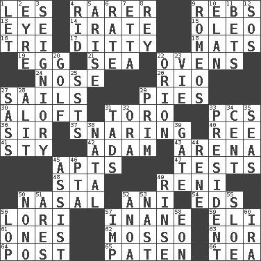 ACROSS 1. French article 4. Less widely known 9. Confederate soldiers (slang) 13. Sight organ 14. Feeling or showing extreme anger 15. Margarine 16. Three (prefix) 17. Short, simple song 18. Floor protectors 19. Oval reproductive body of a fowl 21. Ocean 22. Baking chambers 24. Sense of smell 26. River (Sp.) 27. Travels by water 29. Sliced desserts 30. Upward 31. "Corrida" creature 33. Personal Computers (abbr.) 36. Title for a knight 37. Catching in a trap 40. To sift 41. Filthy place 42. First man 43. Sports stadium 45. Flats, for short 47. Trials 48. R.R. building 49. Painter Guido (1575-1642) 50. Relating to the nose 52. Black tropical American cuckoo 54. Begley and Asner 56. Australian parrot (variant) 57. Lacking in sense or substance 59. Connecticut Ivy Leaguer 61. Singles 62. With motion or animation 63. Not either 64. Mail 65. Eucharist need 66. Beverage made from leaves DOWN 1. Allow 2. Jane of fiction 3. Signiory (variant) 4. To free from 5. Ascend 6. Pace 7. Singer James 8. Marina Del _, California 9. Lover boys 10. Liveliness 11. Stakes 12. Mayday 20. _ course 22. Constellation of myth 23. Compete 25. Fast planes 27. Backtalk 28. Set down 29. Demure 31. Small amounts or degrees 32. Mouth or opening 33. Elected leader of a country 34. Penny 35. Oceans 38. Relating to or accompanying birth 39. Yard entry 44. French philosopher Descartes 45. Help 46. Parent Teacher Association (abbr.) 49. Wash lightly 50. Words to Nanette 51. Ancient Greek god of war 52. Small Philippine buffalo 53. Political cartoonist Thomas 55. _ gin 56. Trim (branches) 57. Mischievous child 58. A really long time 60. Retirement account (abbr.)