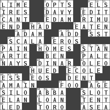 ACROSS 1. Citrus frut 5. Elects 9. Raised railways 12. Angers 13. American folk hero Crockett 14. Prepare for publication 15. Patter 16. Dutch treat 17. Tall New Zealand timber tree 18. Conclude 19. Possessed 21. Eroded 22. First man 24. Find the sum of 26. Fast jet (abbr.) 27. Any of the three canals of the cochlea 28. Greek god of love 29. Ache 30. Residences 32. Comedian Laurel of Laurel & Hardy 36. Johnson of "Laugh-In" 37. Benjamin's nick name 38. Diluted with white 39. Negative votes 40. Middle Eastern gold or silver currency 42. Butter sub 43. Became colored 44. Learning spot: Fr. 46. Double-curved letter 49. Greek goddess of the dawn 50. Undesirable depression on a surface 51. At full speed 53. Egg _ yung 54. Mature 57. Grain storage tower 58. Swedish rock group 61. Slit 62. Enthusiasm 63. Grant temporary use of 64. Portable shelter 65. Directed 66. "Corrida" creature 67. Toward the sea DOWN 1. Louse (plural) 2. SW Asia republic 3. Ananias' fault 4. Eastern Standard Time (abbr.) 5. Wrote a lyric poem 6. Groovy apt. 7. Federal power corp. 8. Symbol (abbr.) 9. Proofreads 10. Citrus fruits 11. Check the growth or development of 14. Epoch 19. Actor Linden 20. Housemaid 21. Begley and Asner 23. Natives or inhabitants of Denmark 24. Sports stadium 25. Two (Sp.) 27. "Two Mules for Sister ____" 28. Make improvements or corrections to 29. Baking dish 31. Off-Broadway awards 32. Soup utensil 33. Baron Munchausen's specialties 34. Toward shelter 35. Modern: prefix 40. Superhero pair 41. Do over again 43. Layer 45. Corporate head (abbr.) 46. Artist's stand 47. Grin 48. Vegetable dish 52. Electrically charged atom 53. Papal veil 55. Went 56. Singer James 58. The first octave above the treble staff 59. Sometimes accompanies a hiss 60. Oblong piece of solid material 61. R.R. building