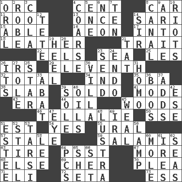 ACROSS 1. The grampus (Milton) 4. Penny 8. Automobile 11. Carrot, for example 13. At one time in the past 14. Indian skirt 15. Competent 16. Period of immesurable duration 17. To the inside or interior of 18. Cordwainer's material 21. Distinguishing feature 22. Snakelike fish 23. Ocean 25. French article 26. Big collection agency 29. Veterans Day date 32. Add up to 34. Working for oneself (abbr.) 35. Chief or king in Benin or Nigeria 38. Thick slice 39. Twentieth part of a lira 41. Method 43. Period 44. Lubricate 45. Forest 46. Copy Pinocchio 50. Compass dir. 51. Eastern Standard Time (abbr.) 54. It is so 55. Mountain range 57. Lacking originality or spontaneity 59. Deli grouping 63. Become fatigued 64. Inconspicuous attention getter 67. Greater amount 68. Otherwise 69. "Mermaids" star 70. Entreaty 71. Biblical high priest 72. Bristle 73. Double-curved letter DOWN 1. Relating to the mouth 2. Loose flowing garment 3. Root beer relative 4. Unrefined 5. Compass dir. 6. Non-commissioned officer (abbr.) 7. Nine, plus one 8. Lessep's creation 9. Nick name for Arthur 10. Debaucheries 12. False hair 14. Title for a knight 19. The bottom of a shoe or boot 20. Pipe bend 21. Make lace 23. Post 24. Inside; within (prefix) 26. ___ a Wonderful Life 27. Hero or heavy, e.g. 28. Play the lead 30. Country residence 31. Same (prefix) 33. Blind as ____ 36. Expressions of contempt or scorn 37. Sums up 39. Not divided or shared with others 40. Petroleums 42. Compass dir. 45. Welt 47. Sight organ 48. A period of five years 49. Retirement account (abbr.) 51. First name in cosmetics 52. Not moving 53. Tarsus (plural) 56. Desk light 58. Area sheltered from the wind 60. Undercover agent 61. Angers 62. Oceans 64. Personal Computers (abbr.) 65. A female animal or person 66. Put into a specified state