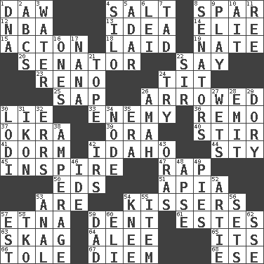 ACROSS 1. Simpleton 4. Table seasoning 8. Practice fight 12. Basketball assoc. 13. It may be bright or harebrained 14. Writer Wiesel 15. NE Massachussets city 18. Put down 19. Nathan's nickname 20. Legislator 22. Declare 23. Western Nevada city 24. Teat (slang) 25. Plant excrement 26. Moved like an arrow 30. Falsehood 33. Foe 36. San ____ (Riviera town) 37. Gumbo ingredient 39. Mouth or opening 40. Use a swizzle stick 41. Dormintory (informal) 42. Potato state 44. Filthy place 45. Motivate 47. Strike 50. Begley and Asner 51. Capital of Western Samoa 53. "We ___ not amused" (Victoria) 54. Smoochers 57. Inactive volcano in Sicily 59. Gouge 61. _____ Park, CO 63. Heroin 64. Toward shelter 65. It is 66. Lacquered or enameled metalware 67. South Vietnam president (1954) 68. Compass dir. DOWN 1. Heredity factor (abbr.) 2. Lettered men learn these first 3. Wetness 4. Grain storage tower 5. The sixth month of the Jewish calendar 6. Luau accessory 7. Small amount or degree 8. Legislators 9. Frolic 10. Small island 11. To separate or throw off 16. Singles 17. Grandmother 21. Drink excessively 22. Title for a knight 24. Attempt 26. Nanny 27. Moistens 28. Send forth 29. Rowboat 30. Farming town in central California 31. Picture 32. Blunders 34. Thickened enlargement 35. Period 38. Electrical Measurement 42. Big collection agency 43. Mouths or openings 46. Binary compound 48. Domed church section 49. Sliced desserts 52. Nick name for Arthur 53. Of or related to the anus 54. Leg joint 55. A distinct part 56. Puts into a specified state 57. Eastern Standard Time (abbr.) 58. Ring climax 59. June honoree 60. Connecticut Ivy Leaguer 62. Compass dir.