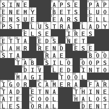 ACROSS 1. Trig term 5. Domed church section 9. Infant food 12. Foe 14. Wagers 15. Nilotic language 16. Follow as a consequence or result 17. Hearing organs 18. Pipe bend 19. Pacific Standard Time (abbr.) 20. A period of five years 23. Kenny Rogers chart-topper in '80 24. Otherwise 25. Angers 27. Singer James 30. Begley and Asner 32. Fish or hair follower 33. Cowardly lion portrayer 34. Tear apart 36. Compass dir. 38. R.R. building 39. Actress Charlotte 40. Oct. 31 cry 43. Bar bill 46. Grain storage tower 48. I made a mistake 49. HTML Container Element 51. Directed 52. To the inside or interior of 53. Wise men 54. Implement 56. Composer Stravinsky 58. Device for capturing images 61. Distant 64. Bit 65. Inactive volcano in Sicily 66. One or ones belonging to thee 68. Had dinner 69. Calm and collected 70. Radiant circles of light 71. French article 72. Relating to the mouth 73. Undesirable depression on a surface DOWN 1. Ooze 2. Taverns 3. A home for chicks 4. Australian flightless bird 5. Collude with 6. Lightbulb-shaped fruit 7. Put through a sieve 8. Curvy letter 9. Entreaties 10. Old (Scot.) 11. More than one (prefix) 13. Shout 21. One who makes use of a thing 22. Spring feasts 23. Allows 24. Hearing organ 26. To separate or throw off 27. Raised railways 28. Make lace 29. Not this but _ 31. Slow-paced one 35. Erase 37. Inky black, to poets 41. Choose 42. Bear (Spanish) 44. The sixth month of the Jewish calendar 45. Of large size 47. Aroma 48. Petroleum 50. Winning man's name 53. Methods 55. Pledge 56. Slanted text style (abbr.) 57. Yard entry 59. Small Philippine buffalo 60. Shopping center 61. Do some clerical work 62. At once, immediately (arch.) 63. Repose 65. Environmental prefix 67. Possessed
