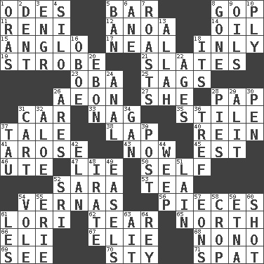 ACROSS 1. Lyric poems 5. Long, evenly shaped piece 8. Grand Old Party 11. Painter Guido (1575-1642) 12. Small Philippine buffalo 14. Petroleum 15. White American of non-Hispanic descent 17. Actress Patricia 18. In an inward manner 19. Disco prop 21. Chalkboards 23. Chief or king in Benin or Nigeria 25. Labels 26. Period of immesurable duration 27. A female animal or person 28. Infant food 31. Automobile 33. Tired old horse 35. Vertical member of a panel or frame 37. Falsehood 38. Infant locale 40. It's straight from the horse's mouth 41. Came up 43. Immediately 45. Eastern Standard Time (abbr.) 46. Shoshoni 47. Whopper 50. Itself 52. "Two Mules for Sister ____" 53. Afternoon social gathering 54. Actresses Bloom and Felton 56. Parts 61. Australian parrot (variant) 62. Rend 65. _ pole 66. Connecticut Ivy Leaguer 67. Writer Wiesel 68. Words to Nanette 69. Observe 70. Filthy place 71. Petty quarrel DOWN 1. Mouths or openings 2. Gouge 3. Engineer (abbr.) 4. Grain storage tower 5. Forbid 6. A saturated hydrocarbon 7. Cooks with dry heat, as in an oven 8. Went 9. Petroleums 10. Travel a route regularly 13. Assad's deity 16. Mitch Miller's instrument 18. ___ a Wonderful Life 20. Inky black, to poets 22. Eons 24. Of or related to the anus 26. Ancient Greek god of war 28. Sliced desserts 29. Set down 30. Fenced enclosure 31. Draw slowly or heavily 32. _ vera 34. Separate the seeds from cotton 36. Not kosher 37. The 19th letter of the Greek alphabet 39. Mail 42. Enthusiasm 44. Shed a tear 48. Feeling or showing extreme anger 49. Artist's stands 51. (Had) reclined 52. Indian title of respect (Mr.) 54. Grand slam 55. 4th largest of the Great Lakes 57. Immeasurably long periods of time 58. Riding implement 59. Inactive volcano in Sicily 60. Opportunity 61. French article 63. Small island 64. Marina Del _, California