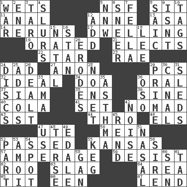 ACROSS 1. Soaks 5. Overdraft (abbr.) 8. Be seated 11. Of or related to the anus 12. Singer Murray 13. White ___ sheet 14. Summer TV shows 17. Home 19. Declaimed 21. Chooses 22. Play the lead 23. Actress Charlotte 24. Male parent 27. Soon (poet.) 29. Personal Computers (abbr.) 32. Perfect 34. ___ good deed 36. Taken by mouth 37. Thailand, formerly 38. Followers of ems 39. Trig term 40. Root beer relative 41. Put into a specified state 42. Roamer 43. Fast jet (abbr.) 44. Through, poetically 46. Raised railways 47. Shoshoni 50. Chow _ 52. Went by 55. Sunflower state 57. Electrical Measurement 59. Stop 62. Friend of Pooh 63. Volcanic refuse 64. Type of rug 65. Teat (slang) 66. Car or cant ending 67. Grant temporary use of DOWN 1. Armed conflict 2. Compass dir. 3. Edible starchy tuberous root 4. Plays smoothly or legato 5. Compass dir. 6. Contemptuous expression 7. Chap (slang) 8. Ketch in the Levant 9. Is not 10. Labels 12. Increase 15. Brizilian seaport 16. Comedian Laurel of Laurel & Hardy 18. Area sheltered from the wind 20. Eats (away) 24. Flat circles 25. Goodbye (Sp.) 26. Started a card game 28. Music written for nine 29. A-one 30. Lessep's creation 31. Bobsleighs 33. Nursemaid (var.) 35. Respiratory problem 36. Bear (Spanish) 42. Annoying sound 45. Tear apart 47. Purpose 48. Laconic 49. Peak District village in England 51. Rhinal 52. Component 53. Mine, in Marseilles 54. Specific locale 55. Cask 56. The founder of a family 58. Separate the seeds from cotton 60. Elected rep. 61. Small boy