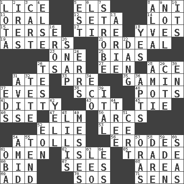ACROSS 1. Louse (plural) 5. Raised railways 8. Black tropical American cuckoo 11. Of the mouth 12. Stalk of a moss capsule 14. Car dealer's back yard 15. Laconic 17. Become fatigued 18. Jacques Cousteau's middle name 19. Michaelmas daisies 21. Severe or trying experience 23. Single 25. Prejudice 26. Russian ruler of old 27. Car or cant ending 28. Adept person 31. Had dinner 33. Before (prefix) 35. Street urchin 37. Nights before holidays 38. _-fi 40. Cooking vessels 41. Short, simple song 43. Baseball player Mel 45. Neckwear 46. Compass dir. 47. Shade tree 50. Arches 52. Writer Wiesel 53. Area sheltered from the wind 54. Ringlike coral islands and reefs 56. Eats (away) 61. Sign of things to come 62. Capri or Wight 65. Barter 66. Storage container 67. Observes 68. Length times width 69. Say or write further 70. Mayday 71. Elected reps. DOWN 1. Globular water bottle used in Asia 2. Angers 3. Haul 4. Otherwise 5. Eastern Standard Time (abbr.) 6. Flowery wreath 7. Disco prop 8. Inventor's middle name 9. Christmas carol 10. ___ a Wonderful Life 13. Nest on high 16. Greek god of love 18. Consenting reply 20. Fastener 22. Mild oath, euphamism for damn 24. Blunders 26. Trial 28. Mine, in Marseilles 29. Quote 30. Followers of ems 31. Advice 32. Wig 34. Environmental prefix 36. Flats, for short 37. Begley and Asner 39. Slanted text style (abbr.) 42. Shout 44. Woody plant 48. Ms. Damita and namesakes 49. Makes clutter 51. Foregone conclusion 52. Period of immesurable duration 54. Among 55. Look after 57. Mouths or openings 58. Have the gumption 59. Locale of original sin 60. Oceans 61. Chief or king in Benin or Nigeria 63. Lion 64. Double-curved letter