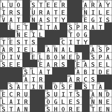 ACROSS 1. Nilotic language 4. Navigate 9. Like ___ of sunshine 13. Big collection agency 14. A salt of uric acid 15. The longest river in the world 16. Large container 17. Offensive 18. Armor plate that protects the chest 19. Allow 21. Call ___ day 22. Small fatty European fish 24. Famous astronaut Armstrong 26. Coat; cloak 27. Trials 29. Municipality 30. Satellite of Uranus 31. Of or related to the anus 33. Cleo's killer 36. HTML Container Element 37. Turned at an angle; bent 40. Health resort 41. Perceive with the eye 42. Hearing organs 43. Artist's stand 45. Narrow board 47. Remain 48. Wind 49. Curves 50. Smooth fabric 52. Order of Saint Francis (abbr.) 54. R.R. building 56. Shade of tan 57. Sets of matching outer garments 59. Plus 61. Den 62. Stares at amorously 63. Compass dir. 64. Comedian Laurel of Laurel & Hardy 65. Dinah or Pauly 66. Nine, plus one DOWN 1. 54 in ancient Rome 2. Mountain range 3. Clearly or manifestly demonstrative 4. Player for Phoenix 5. Lag or linger behind 6. 90 degrees 7. Singer James 8. Marina Del _, California 9. Disorder of the immune system 10. Capital of Latvia 11. Came down and settled, as after flight 12. It is so 20. False hair 22. Vertical member of a panel or frame 23. Cooking vessel 25. Capri or Wight 27. Small amounts or degrees 28. One of the Great Lakes 29. Crow sounds 31. Blind as ____ 32. And not 33. Aide 34. Broke a traffic law 35. Diluted with white 38. Acquire or gain knowledge or skills 39. Letter starter 44. Lettered men learn these first 45. Titan orbits this 46. Cards in a Roman deck? 49. Following 50. Scram! 51. Roberta Peters solo 52. Ending for "Through" and "Enough" 53. Grain storage tower 55. Singer Murray 56. Raised railways 57. Distress signal 58. Compass dir. 60. Lair