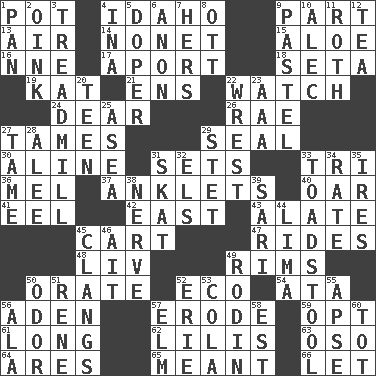 ACROSS 1. Plant holder 4. Potato state 9. Piece 13. Atmosphere 14. Music written for nine 15. Medicinal plant 16. Compass dir. 17. To the left, to Queeg 18. Bristle 19. Krazy ___ of comics 21. Followers of ems 22. Observe 24. Letter starter 26. Actress Charlotte 27. Softens 29. Lick closed 30. Place in a line 31. Puts into a specified state 33. Three (prefix) 36. Cartoonist voice _ Blanc 37. Short socks 40. Boat paddle 41. Snakelike fish 42. Compass direction 43. Having winglike extensions 45. Haul 47. Amusement-park features 48. 54 in ancient Rome 49. Basketball hoops 50. Speak pompously 52. Environmental prefix 54. "One Day ___ Time" 56. An important port of Yemen 57. Wear away 59. Elect 61. Protracted 62. Ms. Damita and namesakes 63. Bear (Spanish) 64. Ancient Greek god of war 65. Intended 66. Allow DOWN 1. Baking dish 2. Pig sound 3. Excercise machine 4. _ tizzy (2 wds.) 5. Drug addict 6. Soon (poet.) 7. Possessive pronoun 8. Baseball player Mel 9. Soft color 10. Actor Baldwin 11. Writer of Portnoy's Complaint (1969) 12. Afternoon social gathering 20. Adolescent 22. Obtain by seizing forcibly or violently 23. American Automobile Association (abbr.) 25. At sea 27. Docile 28. Toward shelter 29. Proofreading order 31. Three-handed card game 32. Raised railways 33. Inedible or poisonous agaric 34. Assign a rank or rating to 35. Angers 38. Impudent aggressiveness 39. Indian skirt 44. Pale green bean 45. Rings loudly 46. Small island 49. "The Thinker" sculptor 50. Scent 51. French philosopher Descartes 52. 4th largest of the Great Lakes 53. Root beer relative 55. Domed church section 56. Wing 57. Shade tree 58. Eastern Standard Time (abbr.) 60. Small child