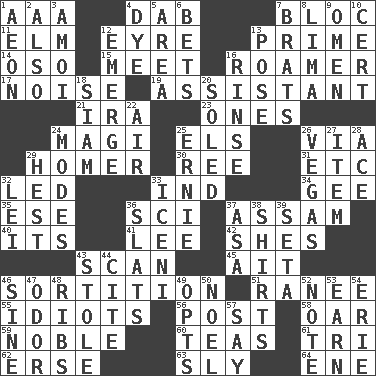ACROSS 1. Auto club (abbr.) 4. Apply (a substance) by light strokes 7. Group of countries in special alliance 11. Shade tree 12. Jane of fiction 13. First class 14. Bear (Spanish) 15. Confront 16. Nomad 17. Annoying sound 19. Aide 21. Retirement account (abbr.) 23. Singles 24. Wise men 25. Raised railways 26. By way of 29. Baseball hit which scores a run 30. Portuguese money of account (variant) 31. And so on (abbr.) 32. Directed 33. Working for oneself (abbr.) 34. Turn to the right 35. Compass dir. 36. _-fi 37. Indian state 40. It is 41. Area sheltered from the wind 42. "______ My Girl" (Turtles hit) 43. Examine hastily 45. Small island 46. Decision 51. The wife of a rajah (variant) 55. Foolish or stupid persons 56. Mail 58. Rowing implement 59. Impressive in appearance 60. Beverages made from leaves 61. Three (prefix) 62. Celtic language 63. Playfully artful 64. Compass dir. DOWN 1. A really long time 2. In addition 3. Mine, in Marseilles 4. Color 5. Type of rug 6. Stakes 7. Naughty children 8. Pale green bean 9. Presage 10. Certainty 12. Develop 13. Introduce or present, as a question 16. Wash lightly 18. Thailand, formerly 20. Having a sole or soles 22. Atmosphere 24. Methods 25. Bert's buddy 26. Viva Las _ 27. A distinct part 28. Adept person 29. Behest 32. Luau accessory 33. Ancient Celtic tribe of eastern Britain 36. Narrow boards 37. White ___ sheet 38. Chest coverings 39. Bristle 43. Fur scarf 44. Quote 46. Trig term 47. Aroma 48. Chest bones 49. Elects 50. Christmas carol 52. Musical sound 53. Merit 54. One of the Great Lakes 57. Declare
