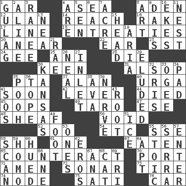 ACROSS 1. Slender fish 4. Toward the sea 8. An important port of Yemen 12. ____ Bator, Mongolia 14. Arrive at 16. Libertine 17. Actor's bit 18. Pleas 20. Approach 22. Ewer handle 23. Fast jet (abbr.) 24. Turn to the right 25. Cuckoo 28. Pass on 30. Peachy ____! 31. Columnist Joseph or Stewart 35. Parent Teacher Assoc. 37. Actor Alda or Thicke 40. Capital and largest city of Mongolia 41. Within a short period 42. Prying instrument 44. Passed on 45. I made a mistake 46. Edible starchy tuberous root 47. Compass dir. 48. To gather and bind into a bundle 50. Null 52. "Barney Miller" actor Jack 54. And so on (abbr.) 55. Compass dir. 58. Quiet! 61. Single 63. Consumed 65. Act in opposition 70. Left side of a ship or aircraft 71. So be it 72. Underwater navigation system 73. Hoop that covers a wheel 74. Connecting point 75. Suttee (variant) 76. Auto DOWN 1. POW camp 2. Place in a line 3. The wife of a rajah (variant) 4. "We ___ not amused" (Victoria) 5. Elected rep. 6. Erode 7. Measure of real estate 8. Nonscientific branch of learning 9. Raised platform 10. Supplements with great effort 11. Egg locale 13. Teachers' org. 15. Froth on beer 19. Roberta Peters solo 21. Actress Charlotte 26. Be tempered by heat 27. An arm off of a larger body of water 29. Dodged 30. Sunflower state 32. Indian titles of respect 33. Double curve, resembling the letter S 34. Groovy apt. 35. "Silly old bear" 36. Drink excessively 38. Actress Gardner 39. Boldness 41. Mayday 43. Carrot, for example 49. 12 inches 51. Frozen water 53. Washington bills 55. Unemotional 56. Spanish missionary in California 57. Keyboard key 58. Examine minutely or intensely 59. Like (prefix) 60. Took on color 62. Greek god of love 64. Fitting 66. Compass dir. 67. Santa ___, CA 68. Domesticated feline 69. Three (prefix)