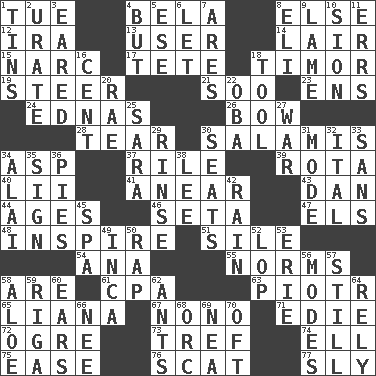 ACROSS 1. Third day of the wk. 4. Actor Lugosi 8. Otherwise 12. Lyricist Gershwin 13. One who makes use of a thing 14. Den 15. Drug cop 17. Wig 18. Southeast Indonesia island 19. Bull 21. "Barney Miller" actor Jack 23. Followers of ems 24. Ferber et al. 26. Ribbon knot 28. Separate forcefully 30. Deli grouping 34. Cleo's killer 37. Cause heat under the collar 39. Roll call or roster of names 40. Cards in a Roman deck? 41. Approach 43. Daniel's nick name 44. Eras 46. Bristle 47. Raised railways 48. Motivate 51. Filth; sediment 54. Santa ___, CA 55. Typical standards 58. "We ___ not amused" (Victoria) 61. Tax preparer (abbr.) 63. Peter (Polish) 65. Woody, climbing, usually tropical plant 67. Words to Nanette 71. Singer Brickell 72. Legendary monster 73. Not kosher 74. Pipe bend 75. Relaxation 76. Go away! 77. Cunning DOWN 1. Canisters 2. A salt of uric acid 3. Having ears or earlike features 4. With the exception that 5. Compass dir. 6. Allow 7. Ancient Greek god of war 8. Biblical high priest 9. Unable to walk 10. The Jewish people; Israel 11. Blunders 16. Penny 18. Utensil 20. Actress Charlotte 22. Chief or king in Benin or Nigeria 25. "Two Mules for Sister ____" 27. Armed conflict 29. Remove soap 30. Theater features 31. Method 32. Slanted text style (abbr.) 33. Without 34. Mountain range southwest of Kyrgyzstan 35. Omen 36. Sliced desserts 38. Area sheltered from the wind 42. Precipitation 45. Health resort 49. South American Indian 50. Hit sharply and swiftly 52. Trim (branches) 53. One of the Great Lakes 56. Methods 57. Not moving 58. _ vera 59. Port city in Latvia 60. Hearing organs 62. Pismires 64. Depend 66. Born 68. The grampus (Milton) 69. Teachers' org. 70. Often (poetically)