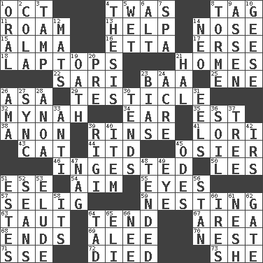 ACROSS 1. Sep. follower 4. It was, poetically 8. Label 11. Wander aimlessly 13. Assist 14. Sense of smell 15. _ mater 16. Singer James 17. Celtic language 18. Portable computers 21. Dwellings 22. Indian skirt 23. Sound made by sheep 25. Compass dir. 26. White ___ sheet 29. One of the two male reproductive glands 32. Non-adult bird? 34. Ewer handle 35. Eastern Standard Time (abbr.) 38. At once, immediately (arch.) 39. Remove soap 41. Australian parrot (variant) 43. Feline 44. It would 45. Flexible twig of a willow tree 46. Eaten 50. French article 51. Compass dir. 54. Direct toward a target or goal 55. Sight organs 57. Former Milwaukee Brewers owner Bud 59. Snuggling 63. Pulled tight 64. Be inclined (to) 67. Type of rug 68. Extremities 69. Toward shelter 70. Egg locale 71. Compass dir. 72. Passed on 73. A female animal or person DOWN 1. Relating to the mouth 2. Root beer relative 3. Pack (down) 4. College paper 5. Dripping 6. The first octave above the treble staff 7. Health resort 8. Singer Mel 9. NE Netherlands city 10. Honkers 12. Floor protectors 14. Modern: prefix 19. Pledge 20. Before (prefix) 21. Actor Linden 23. Prejudice 24. 1/640 square mile 26. Wet nurse (var.) 27. Synchronize (abbr.) 28. Small Philippine buffalo 30. Looks after 31. Snakelike fish 33. Against 36. Earth 37. Woody plant 39. Swiss mountan, "Queen of the Mountains" 40. A whole individual unit 42. Big collection agency 45. Lyric poems 47. Tired old horse 48. Watched over 49. Sight organ 51. _____ Park, CO 52. Actors Connery and Penn 53. Evade 56. Comedian Laurel of Laurel & Hardy 58. It is 60. Angers 61. Tender 62. Yard entry 64. Small amount or degree 65. Biblical high priest 66. Born