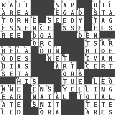 ACROSS 1. Electrical Unit 5. Plant excrement 8. Petroleum 11. Type of rug 12. Mild oath 14. R.R. building 15. Singer Mel 17. Sleazy 18. Label 19. Substance 21. Compass dir. 22. Raised railways 23. To sift 24. ___ good deed 25. Lair 27. The grampus (Milton) 28. Russian ruler of old 31. Actor Lugosi 35. Spanish title 37. Flintstone garb 38. Lyric poems 39. Dripping 41. _ the terrible 42. Prejudice 43. Tate display 45. Foregone conclusion 46. Bristle 47. Globe 49. Part of HMS, perhaps 51. Third day of the wk. 52. Lion 55. Compass dir. 57. Followers of ems 60. Crying or shouting loudly 62. Ewer handle 63. Brizilian seaport 65. Add up to 66. Had dinner 67. In a ____ (agitated or irritated) 68. False hair 69. Directed 70. Mouth or opening 71. Ancient Greek god of war DOWN 1. Wetness 2. Came up 3. Laconic 4. Docile 5. Perceive with the eye 6. Grows older 7. Groovy apts. 8. Clearly or manifestly demonstrative 9. Slanted text style (abbr.) 10. Straggles 13. Colored 16. Inside; within (prefix) 17. Manatee 20. Drawstring 26. Moral principle 29. The sixth month of the Jewish calendar 30. Monthly bill 31. Moves up and down 32. Singer Brickell 33. Tough but pliablecoriaceous 34. Slender Brazilian palm 36. Teachers' org. 40. Trinitrotoluene 44. Loyal 48. Waist strap 50. Elected reps. 52. 61 cubic inches 53. Maternal 54. Stares at amorously 55. Be tempered by heat 56. Nathan's nickname 58. Billionth: prefix 59. Agitate 61. Globular water bottle used in Asia 64. _ moment's notice (2 wds.)