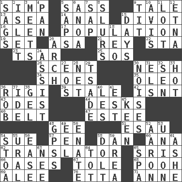 ACROSS 1. Simple or foolish person 5. Backtalk 9. Falsehood 13. Toward the sea 14. Of or related to the anus 15. A piece of turf (Scot.) 16. Small, secluded valley 17. Census information 19. Arrange properly for use 20. White ___ sheet 21. Marina Del _, California 22. R.R. building 23. Russian ruler of old 25. Mayday 26. Aroma 30. Tender 34. Imelda's hoard 35. Margarine 36. Swiss mountan, "Queen of the Mountains" 39. Lacking originality or spontaneity 42. Is not 43. Lyric poems 44. Writing tables 46. Waist strap 47. First name in cosmetics 48. Turn to the right 51. He sold his birthright 54. Institute legal proceedings 57. Animal enclosure 58. One of the 12 tribes of Israel 60. Santa ___, CA 62. Interpreter 65. Indian titles of respect 66. Fertile tracts in a desert 67. Lacquered or enameled metalware 68. "Silly old bear" 69. Toward shelter 70. Singer James 71. Queen of England 1702-14 DOWN 1. Settles 2. Small island 3. Confronts 4. Baking dish 5. Plant excrements 6. Small Philippine buffalo 7. Plant excrement 8. Plays smoothly or legato 9. Teat (slang) 10. Deliberation 11. Spoils 12. Inactive volcano in Sicily 15. 24-hour periods 18. Lion 20. Bowlike part 24. Help 27. Greek goddess of the dawn 28. Remaining after all deductions 29. Sadhe (variant) 30. Annoying sounds 31. Raised railways 32. Elected rep. 33. Being at a high temperature 36. Director Reiner 37. Binary compound 38. Set 40. French article 41. Eastern Standard Time (abbr.) 45. Peachy ____! 48. Global Positioning Systems (abbr.) 49. Snakelike fish 50. Related on the mother's side 52. Composer Copland 53. The state of being joined or united 54. Portico 55. Mountain range 56. Comfort 58. Dunce 59. Length times width 61. American tennis player Robert 63. Born 64. Small child 65. Health resort