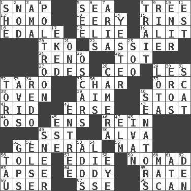 ACROSS 1. Fastener 5. Ocean 8. Relationship diagram 12. Same (prefix) 13. Suggestive of the supernatural 15. Basketball hoops 16. Peak District village in England 18. Writer Wiesel 19. Set down 20. Ring climax 22. More disrespectful 24. Western Nevada city 26. Small child 27. Lyric poems 28. Corporate head (abbr.) 29. French article 32. Edible starchy tuberous root 35. Burn to charcoal 37. The grampus (Milton) 38. Baking chamber 39. Direct toward a target or goal 40. Portico 41. To free from 42. Celtic language 43. 90 degrees 44. Bear (Spanish) 45. Followers of ems 46. It's straight from the horse's mouth 49. Fast jet (abbr.) 50. Inventor's middle name 51. Commissioned military rank 55. Floor covering 56. Lacquered or enameled metalware 57. Singer Brickell 59. Roamer 63. Domed church section 64. Whirlpool 65. Assign a rank or rating to 66. One who makes use of a thing 67. Compass dir. 68. Glance over DOWN 1. A female animal or person 2. Allow head to fall sleepily 3. Wet nurse (var.) 4. Characterized by complete cowardliness 5. Observe 6. Snakelike fish 7. Roberta Peters solo 8. Distinguishing feature 9. Cause heat under the collar 10. Independent ruler or chieftain 11. Eastern Standard Time (abbr.) 14. Of or pertaining to yesterday 17. Made supply last 21. Single 23. "Barney Miller" actor Jack 25. Motion picture awards 28. Device for capturing images 29. Globular water bottle used in Asia 30. Greek god of love 31. Leave at once 32. "Corrida" creature 33. Deliberation 34. Make new 36. Part of HMS, perhaps 40. Elected representatives 42. Main course 45. Compass dir. 47. Shade tree 48. _ the terrible 49. Scornful expression 51. Republicans 52. Otherwise 53. Sums up 54. Flaplike coverings 56. The 19th letter of the Greek alphabet 58. Sight organ 60. Apple computer (short form) 61. _ moment's notice (2 wds.) 62. Lair