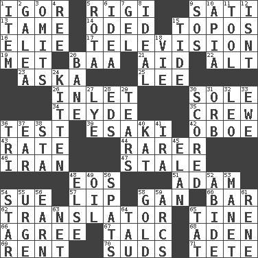 ACROSS 1. Russian composer Stravinsky 5. Swiss mountan, "Queen of the Mountains" 9. Suttee (variant) 13. Docile 14. Wrote a lyric poem 15. Literary convention 16. Writer Wiesel 17. Boob tube 19. Was introduced to 20. Sound made by sheep 21. Assist 22. Keyboard modifier key 23. "____ silly question..." 25. Area sheltered from the wind 26. An arm off of a larger body of water 30. Flatfish 34. Miss Universe 1986, Barbara Palacios _ 35. Ship's personnel 36. Trial 39. 1973 Nobel Price Winner (Physics) Leo 42. Mitch Miller's instrument 43. Pace 44. Less widely known 46. SW Asia republic 47. Having lost freshness 48. Greek goddess of the dawn 51. First of billions? 54. Take to court 57. Mouth edge 58. Separate the seeds from cotton 60. Tavern 62. Interpreter 65. Prong on a fork 66. Match 67. Baby powder 68. Arabian gulf 69. Monthly bill 70. Beer foam 71. Wig DOWN 1. A whole individual unit 2. An organ shaped like a helmet 3. Leaves out 4. To separate or throw off 5. Round or rotation of duties 6. The main thing one is thinking about 7. Set 8. Perfect 9. Distress signal 10. Capital of Western Samoa 11. Instrument 12. Is not 15. Periodic rise and fall of the sea level 18. Compete 20. Object of repulsion 24. Baby cat 27. Potassium hydroxide 28. Begley and Asner 29. Rends 30. Tallied 31. Globe 32. Lion 33. She-sheep 36. Three (prefix) 37. Ewer handle 38. R.R. building 40. Krazy ___ of comics 41. Retirement account (abbr.) 45. Style 48. Otherwise 49. Petroleum 50. Arguments over trivial matters 52. Stay 53. French painter Edouard 54. Play the lead 55. Goad 56. Merit 58. Aureate 59. Curves 61. French philosopher Descartes 63. Remaining after all deductions 64. The 19th letter of the Greek alphabet 65. Make lace