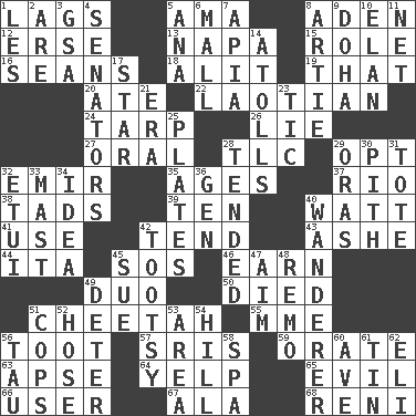 ACROSS 1. Fails to keep up a pace 5. Nanny (var.) 8. Arabian gulf 12. Celtic language 13. California wine valley 15. Hero or heavy, e.g. 16. Seines 18. Came down and settled, as after flight 19. Not this but _ 20. Had dinner 22. Of or relating to Laos or its people 24. Canvas cover 26. Whopper 27. Spoken 28. Affectionate concern, for short 29. Elect 32. Arab leader 35. Grows older 37. River (Sp.) 38. Small boys 39. Nine, plus one 40. Electrical Unit 41. Purpose 42. Watch over 43. American tennis player Robert 44. Call ___ day 45. Distress signal 46. Merit 49. Superhero pair 50. Passed on 51. Leopard's kin 55. Madame (abbr.) 56. A blast of a horn 57. Indian titles of respect 59. Declaim 63. Domed church section 64. Sharp bark 65. Tending to cause great harm 66. One who makes use of a thing 67. Wing 68. Painter Guido (1575-1642) DOWN 1. French article 2. "We ___ not amused" (Victoria) 3. Girls' org. (abbr.) 4. Elected representatives 5. Santa ___, CA 6. Shopping center 7. Capital of Western Samoa 8. Nick name for Arthur 9. Capital of the state of Qatar 10. Enthusiasm 11. Fish or hair follower 14. Ringlike coral islands and reefs 17. Play the lead 21. Period 23. Nervous spasm 25. Food holders 28. Looked after 29. Mouths or openings 30. Essential or central part 31. Lug 32. Needle case 33. Vertical spar for supporting sails 34. The content of cognition 36. Commissioned military rank (abbr.) 40. Roamer 42. Tootsie (variant) 45. Institute legal proceedings 47. Direct toward a target or goal 48. San ____ (Riviera town) 49. Prevent from occurring 51. 911 reaches them 52. Flexible conduit 53. Length times width 54. Land elevation 56. The 19th letter of the Greek alphabet 58. Health resort 60. "___ Maria" 61. Shallow baking pan 62. Biblical high priest