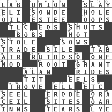 ACROSS 1. Experiment locale 4. The state of being joined or united 9. Kill 13. Biblical high priest 14. Message 15. Opening into or through something 16. Lubricate 17. First name in cosmetics 18. I made a mistake 19. Affectionate concern, for short 21. Greek goddess of the dawn 22. Particles of soot 24. Moves up and down 26. Being at a high temperature 27. Took without asking 29. Sty mamas 30. Swap 31. Filth; sediment 33. Keyboard key 36. Atmosphere 37. Noisy, rowdy, vocal (Spanish) 40. Single 41. Dreamland 42. Carrot, for example 43. Monetary aid 45. Actor Alda or Thicke 47. Amusement-park features 48. Teat (slang) 49. Snakelike fish 50. Collection of objects 52. Pipe bend 54. And so on (abbr.) 56. Stitch closed the eyes of (a falcon) 57. Eat (away) 59. Mouth or opening 61. To provide with a ceiling 62. Locates 63. Rowing implement 64. Taverns 65. Pulls apart 66. Potassium hydroxide DOWN 1. Lion 2. Came down and settled, as after flight 3. Big road sign 4. Purpose 5. Olfactory organs 6. To the inside or interior of 7. Lyric poems 8. Born 9. Yells 10. Plunder 11. High mountains 12. Affirmative reply 20. Lacking warmth 22. Imelda's hoard 23. Cut the grass 25. Fermented drink made from hops 27. Comedian Laurel of Laurel & Hardy 28. Musical group of three 29. Notch 31. The Jewish people; Israel 32. Wedding promise 33. Inedible or poisonous agaric 34. Singer Murray 35. Wagers 38. A salt of uric acid 39. Legendary monster 44. Cause heat under the collar 45. Ringlike coral islands and reefs 46. 54 in ancient Rome 49. A person who is older than you are 50. Adolescent 51. It's straight from the horse's mouth 52. 4th largest of the Great Lakes 53. Globular water bottle used in Asia 55. Supercomputer manufacturer 56. _-fi 57. Eastern Standard Time (abbr.) 58. Curvy letter 60. "We ___ not amused" (Victoria)