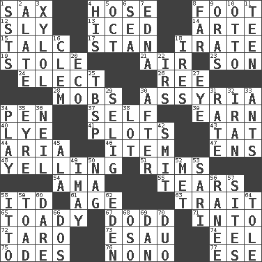ACROSS 1. Saxophone 4. Flexible conduit 8. 12 inches 12. Insidious 13. On the rocks 14. Johnson of "Laugh-In" 15. Baby powder 17. Comedian Laurel of Laurel & Hardy 18. Feeling or showing extreme anger 19. Took without asking 21. Atmosphere 23. Male child 24. Voters do this 26. Portuguese money of account (variant) 28. Crowds into 30. Nineveh was its capital 34. Animal enclosure 37. Automatic 39. Merit 40. Potassium hydroxide 41. Ground plans 43. Make lace 44. Roberta Peters solo 46. A whole individual unit 47. Followers of ems 48. Crying or shouting loudly 51. Basketball hoops 54. Wet nurse (var.) 55. Rends 58. It would 61. Personal question 63. Distinguishing feature 65. Sycophant 67. Texas town _ City 71. To the inside or interior of 72. Edible starchy tuberous root 73. Son of Isaac 74. Snakelike fish 75. Lyric poems 76. Words to Nanette 77. Compass dir. DOWN 1. Fast planes 2. Having winglike extensions 3. Xylene (variant) 4. Part of HMS, perhaps 5. Sep. follower 6. Ocean 7. Pulitzer Prize-winning author Ferber 8. At a great distance 9. Mouths or openings 10. "Beetle Bailey" pooch 11. Adolescent 16. Clement's nick name 18. Angers 20. Environmental prefix 22. Big collection agency 25. Cook's measure (abbr.) 27. Sight organ 29. Former Milwaukee Brewers owner Bud 30. Following 31. Pace 32. SW Asia republic 33. Pismires 34. Live dramatic performance 35. Jane of fiction 36. Famous astronaut Armstrong 38. Car dealer's back yard 42. Stricken, poetically 45. According to 49. "If ____ say so..." 50. Tired old horse 52. Was introduced to 53. Indian skirt 56. Indian princess (variant) 57. Locates 58. "Tell ____ the Marines!" 59. Frog relative 60. Have the gumption 62. Paradise 64. Lacquered or enameled metalware 66. Two (Sp.) 68. Bear (Spanish) 69. One of the 12 tribes of Israel 70. Superhero pair