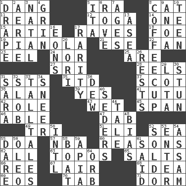 ACROSS 1. Mild oath, euphamism for damn 5. Retirement account (abbr.) 8. Domesticated feline 11. Hitchcock's "____ Window" 12. Ancient Roman robe 14. Single 15. Nick name for Arthur 17. All-night dance parties 18. Enemy 19. Player piano 21. Compass dir. 22. Air blower 23. Snakelike fish 24. Not either 25. "We ___ not amused" (Victoria) 27. Indian title of respect (Mr.) 28. Snakelike fish 31. Fast planes 35. It would 37. Highlander 38. Actor Alda or Thicke 39. Consenting reply 41. Ballerina skirt 42. Hero or heavy, e.g. 43. Soggy 45. Connect, as a bridge 46. Competent 47. Apply (a substance) by light strokes 49. Three (prefix) 51. Biblical high priest 52. Ocean 55. ___ good deed 57. Basketball assoc. 60. Thinks logically 62. Everything 63. Literary convention 65. Table seasonings 66. To riddle 67. Den 68. It may be bright or harebrained 69. Greek goddess of the dawn 70. Bar bill 71. Dormintory (informal) DOWN 1. Window treatment 2. Nest on high 3. Brizilian seaport 4. Broad smile 5. Call ___ day 6. Be footloose 7. Eons 8. Java holder (2 wds.) 9. Small Philippine buffalo 10. Adolescent 13. At sea 16. Immeasurably long periods of time 17. Noteworthy scarcity 20. Australian parrot (variant) 26. Musical pauses 29. Globular water bottle used in Asia 30. Surprise greatly 31. "Two Mules for Sister ____" 32. Oscar Madison type 33. Baron Munchausen's specialties 34. Scornful expression 36. Morning condensation 40. Spring feasts 44. Story 48. Prejudice 50. International (abbr.) 52. Twentieth part of a lira 53. Keyboard key 54. Indian state 55. Have the gumption 56. Butter sub 58. Water vessel 59. Capital of Western Samoa 61. Expressed in words 64. Globe