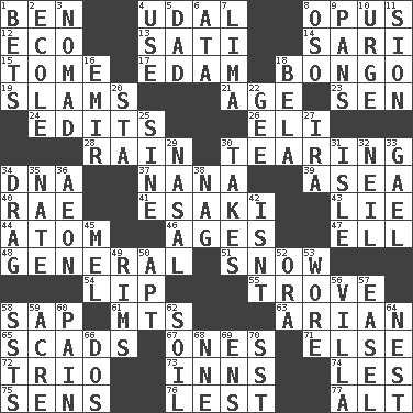 ACROSS 1. Benjamin's nick name 4. Allodial 8. Musical composition 12. Environmental prefix 13. Suttee (variant) 14. Indian skirt 15. Heavy book 17. Dutch treat 18. Beat drum 19. Hits or strikes with great force 21. Mature 23. Elected rep. 24. Prepares for publication 26. Biblical high priest 28. Precipitation 30. Pulling into pieces 34. Heredity factor (abbr.) 37. Nanny 39. Toward the sea 40. Actress Charlotte 41. 1973 Nobel Price Winner (Physics) Leo 43. Whopper 44. Smallest unit of an element 46. Matures 47. Pipe bend 48. Commissioned military rank 51. Overwhelm 54. Mouth edge 55. Collection of objects 58. Plant excrement 61. Mountains (abbr.) 63. Believer in; advocate of (suffix) 65. Oodles 67. Singles 71. Otherwise 72. Musical group of three 73. Restaurants 74. French article 75. Elected reps. 76. For fear that 77. The first octave above the treble staff DOWN 1. Wagers 2. Learning spot: Fr. 3. Roamer 4. Purpose 5. Male parent 6. "One Day ___ Time" 7. Pale green bean 8. Bear (Spanish) 9. Zero-star reviews 10. Goad 11. The Jewish people; Israel 16. Arab leader 18. Actor Lugosi 20. R.R. building 22. Turn to the right 25. Trig term 27. Lyricist Gershwin 29. Relating to the nose 30. Receives possession of 31. Small island 32. Famous astronaut Armstrong 33. Highlander 34. To be drawn or hauled along 35. Nathan's nickname 36. Period of immesurable duration 38. Tired old horse 42. Is not 45. Cartoonist voice _ Blanc 49. Basketball hoops 50. Fitting 52. Mouth or opening 53. Had on 56. Country estate 57. Artist's stand 58. Fast planes 59. Measure of real estate 60. Ache 62. The visible part of the earth's surface 64. A home for chicks 66. Two (Sp.) 68. Compass dir. 69. Followers of ems 70. Fast jet (abbr.)