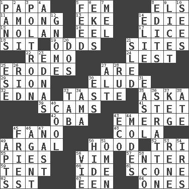 ACROSS 1. Dad 5. Opposite of masc. 8. Raised railways 11. Amid 13. Make supply last 14. Singer Brickell 15. Pitcher Ryan 16. Snakelike fish 17. Louse (plural) 18. Be seated 19. Probability 21. Locates 22. San ____ (Riviera town) 24. For fear that 25. Eats (away) 27. "We ___ not amused" (Victoria) 29. The Jewish people; Israel 30. Evade 32. Pulitzer Prize-winning author Ferber 33. Clothes sense 35. "____ silly question..." 39. Fraudulent business schemes 41. Proofreading order 42. Chief or king in Benin or Nigeria 43. Develop 45. Papal veil 48. Root beer relative 49. Therefore, facetiously 50. Parka part 52. Three (prefix) 55. Sliced desserts 56. Zeal 57. Keyboard key 59. Portable shelter 60. Binary compound 61. Biscuitlike quick bread 62. Fast jet (abbr.) 63. Car or cant ending 64. Singles DOWN 1. Baking dishes 2. Mine, in Marseilles 3. Coward 4. Santa ___, CA 5. Nourish 6. Makes supply last 7. Cartoonist voice _ Blanc 8. Prepares for publication 9. It is permitted: Lat. 10. Perceives with the eye 12. Dwarf 14. Writer Wiesel 20. Two (Sp.) 21. Downhill vehicle 23. Ferber et al. 25. Compass dir. 26. To free from 27. Keyboard modifier key 28. Regret 30. Double-curved letter 31. Artist's stand 33. Keyboard key 34. Nanny (var.) 36. Ski resort town in Vermont 37. Barrel 38. Had dinner 40. Calm and collected 43. Environmental prefix 44. Methods 45. Strips of potato fried in deep fat 46. Rep 47. Political cartoonist Thomas 49. Tenement units (abbr.) 50. Flintstone garb 51. Presage 53. French philosopher Descartes 54. Angers 56. Compete 58. Non-commissioned officer (abbr.)