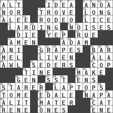 ACROSS 1. The first octave above the treble staff 4. It may be bright or harebrained 8. Small Philippine buffalo 12. Not either 13. Collection of objects 14. Yearn 15. Toward shelter 17. Cowboy competition 18. Louse (plural) 19. Preparing or cooking with lard 21. Annoying sounds 23. Pass on 24. Slangy assent 26. Regret 27. So be it 28. First of billions? 30. Black tropical American cuckoo 31. Wine fruits 34. Soap unit 37. Cartoonist voice _ Blanc 38. Make or become more lively 39. Wing 40. Leather borer 41. Spring feasts 42. Police officer (slang) 43. Prong on a fork 44. Create 46. Commissioned military rank (abbr.) 47. Fast jet (abbr.) 50. Followers of ems 51. A viewer who gazes fixedly 54. Portable computers 57. Heavy book 58. Peak District village in England 60. California wine valley 62. Came down and settled, as after flight 63. Mother 64. Feline 65. French philosopher Descartes 66. Singles 67. Compass dir. DOWN 1. Santa ___, CA 2. Hang loosely or laxly 3. Excercise machine 4. Literary sarcasm 5. Evade 6. Night before a holiday 7. Period of immesurable duration 8. Plant genus of onion and garlic 9. Annoying sound 10. At one time in the past 11. Ripens 13. Three (prefix) 16. One of the Great Lakes 20. Lair 22. Mouths or openings 25. Some stationery 27. Afresh 29. Habitations of wild animals 30. Nursemaid (var.) 31. Small, secluded valley 32. Amusement-park features 33. "___ Maria" 34. Keyboard key 35. Medicinal plant 36. Strike 41. Trig term 43. Cylindrical with tapered ends 44. Was introduced to 45. At once, immediately (arch.) 46. Homeless child 48. Schedule 49. Falsehoods 51. Play the lead 52. Lacquered or enameled metalware 53. San ____ (Riviera town) 55. For each 56. Connect, as a bridge 59. One of the 12 tribes of Israel 61. Had dinner