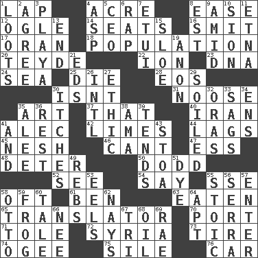 ACROSS 1. Infant locale 4. Measure of real estate 8. Relaxation 12. Stare at amorously 14. Theater features 16. Stricken, poetically 17. NW Algerian seaport 18. Census information 20. Miss Universe 1986, Barbara Palacios _ 22. Electrically charged atom 23. Heredity factor (abbr.) 24. Ocean 25. Expire 28. Greek goddess of the dawn 30. Is not 31. Trap for birds or small mammals 35. Tate display 37. Not this but _ 40. SW Asia republic 41. Actor Baldwin 42. Citrus fruits 44. Fails to keep up a pace 45. Soft 46. Patter 47. Double-curved letter 48. Prevent from occurring 50. Texas town _ City 52. Perceive with the eye 54. Declare 55. Compass dir. 58. Often (poetically) 61. Benjamin's nick name 63. Eroded 65. Interpreter 70. Left side of a ship or aircraft 71. Lacquered or enameled metalware 72. Damascus' land 73. Become fatigued 74. Double curve, resembling the letter S 75. Drop; flow; fall 76. 4-wheeled motor vehicle DOWN 1. Plunders 2. Match 3. Beach, in Buenos Aires 4. Viper 5. Corporate head (abbr.) 6. Hit sharply and swiftly 7. Needle case 8. Eastern Standard Time (abbr.) 9. Among 10. The Jewish people; Israel 11. Inactive volcano in Sicily 13. Conclusion 15. _ gin 19. Soon (poet.) 21. Begley and Asner 26. International (abbr.) 27. Value system 29. Dirtied 30. Strong, restless desires 32. Mouths or openings 33. Sinks 34. Followers of ems 35. Toward shelter 36. Take ten 38. Nanny (var.) 39. Is inclined (to) 41. Also 43. Portico 49. Confederate soldiers (slang) 51. Color 53. Snakelike fish 55. Unemotional 56. Father Junipero _ 57. Keyboard key 58. Von Bismarck 59. Toadlike animal 60. Lie 62. Negative votes 64. Fitting 66. Born 67. Three (prefix) 68. Petroleum 69. Actress Charlotte