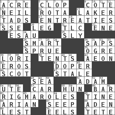 ACROSS 1. 1/640 square mile 5. Hoof sound 9. ____ d'Azur (French Riviera) 13. Famous astronaut Armstrong 14. Roll call or roster of names 15. Member of a famous L.A. basketball team 16. Bits 17. Pleas 19. Compass dir. 20. Part of a journey 21. Affectionate concern, for short 22. Compass dir. 23. He sold his birthright 25. Playfully artful 26. Don Adams' spy role 30. Plant excrements 34. Disorder 35. Legendary monster 36. Australian parrot (variant) 39. Portable shelters 42. Period of immesurable duration 43. Greek god of love 44. Drug addict 46. Native of Scotland 47. Showing deterioration from age 48. Ocean 51. First of billions? 54. Shoshoni 57. Auto 58. Attila the _ 60. Tavern 62. Complicated, petty procedures 65. Prong on a fork 66. Believer in; advocate of (suffix) 67. Ooze 68. An important port of Yemen 69. For fear that 70. Snakelike fish 71. False hair DOWN 1. Pismires 2. Desist 3. Amusement-park features 4. Raised railways 5. Algonquian 6. Protracted 7. Baseball player Mel 8. Pieces 9. Feline 10. Migrant worker of the '30s 11. Adolescent 12. Celtic language 15. Made of lace 18. Pipe bend 20. Mass 24. Aid 27. Nonscientific branch of learning 28. Regret 29. Watches over 30. Flew 31. Mature 32. Adept person 33. Elected rep. 36. French article 37. The grampus (Milton) 38. Friend of Pooh 40. Small child 41. Health resort 45. Liveliness 48. Glance over 49. Ewer handle 50. Came up 52. Stay 53. French painter Edouard 54. Mountain range 55. Become fatigued 56. Armor plate that protects the chest 58. Person who is morally reprehensible 59. United States Postal Service (abbr.) 61. French philosopher Descartes 63. Floor covering 64. Area sheltered from the wind 65. Make lace