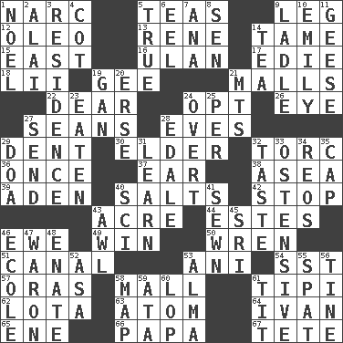 ACROSS 1. Drug cop 5. Beverages made from leaves 9. Part of a journey 12. Butter sub 13. French philosopher Descartes 14. Docile 15. Compass direction 16. ____ Bator, Mongolia 17. Singer Brickell 18. Cards in a Roman deck? 19. Turn to the right 21. Shopping centers 22. Letter starter 24. Choose 26. Sight organ 27. Actors Connery and Penn 28. Nights before holidays 29. Gouge 30. A person who is older than you are 32. Torque (variant) 36. At one time in the past 37. Hearing organ 38. Toward the sea 39. An important port of Yemen 40. Table seasonings 42. Obstruct or block passage 43. Land measure 44. _____ Park, CO 46. She-sheep 49. Victory 50. Songbird 51. Lessep's creation 53. Cuckoo 54. Fast jet (abbr.) 57. Mouths or openings 58. Promenade 61. Native american tent (variation) 62. Globular water bottle used in Asia 63. Tiny particle 64. _ the terrible 65. Compass dir. 66. Dad 67. Wig DOWN 1. Christmas carol 2. Jai _ 3. Home 4. Small bed 5. Loyal 6. Snakelike fish 7. Santa ___, CA 8. Elected rep. 9. Dipping utensil 10. Poet Dickinson 11. Honkers 14. Beverage made from leaves 19. Separate the seeds from cotton 20. Celtic language 21. Mountains (abbr.) 23. Ingested 24. Unconcealed 25. For each 27. Transmit 28. Peak District village in England 29. ___ good deed 31. Acquire or gain knowledge or skills 32. Clothes sense 33. Clearly or manifestly demonstrative 34. Vintage cars 35. Head covering 40. _-fi 41. Stitched 43. Leather borer 45. Indian title of respect (Mr.) 46. Learning spot: Fr. 47. Make _____ (do battle with) 48. Maternal 52. White ___ sheet 53. _ mater 55. Petty quarrel 56. Prong on a fork 58. Atlas unit 59. _ moment's notice (2 wds.) 60. Trim (branches) 61. Teat (slang)