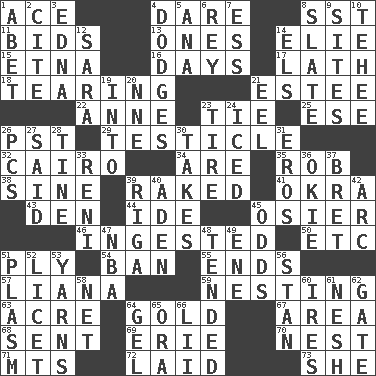 ACROSS 1. Adept person 4. Have the gumption 8. Fast jet (abbr.) 11. Auction offers 13. Washington bills 14. Writer Wiesel 15. Inactive volcano in Sicily 16. 24-hour periods 17. Thin strip of wood or metal 18. Rending 21. First name in cosmetics 22. Queen of England 1702-14 23. Neckwear 25. Compass dir. 26. Pacific Standard Time (abbr.) 29. A testis 32. Capital of Egypt 34. "We ___ not amused" (Victoria) 35. Director Reiner 38. Trig term 39. Moved through 41. Gumbo ingredient 43. Lair 44. Binary compound 45. Flexible twig of a willow tree 46. Consumed 50. And so on (abbr.) 51. Travel a route regularly 54. Prohibit 55. Conclusions 57. Climbing, woody, usually tropical vines 59. Nestling 63. Land measure 64. Gilt 67. Length times width 68. Transmitted 69. 4th largest of the Great Lakes 70. Egg locale 71. Mountains (abbr.) 72. Put down 73. A female animal or person DOWN 1. Collude with 2. Quote 3. Pulitzer Prize-winning author Ferber 4. Evades 5. Santa ___, CA 6. Marina Del _, California 7. Curvy letter 8. Schedule 9. Settings 10. Giggle 12. "Two Mules for Sister ____" 14. Raised railways 19. To the inside or interior of 20. Compass dir. 21. Snakelike fish 23. Hoop that covers a wheel 24. On the rocks 26. Personal Computers (abbr.) 27. Expressed in words 28. Prong on a fork 30. Receives possession of 31. Greek god of love 33. Painter Guido (1575-1642) 36. Migrant worker of the '30s 37. Cy Young winner Saberhagen 39. Capital of Latvia 40. An important port of Yemen 42. Curve 45. Likelihood 47. Basketball assoc. 48. Watched over 49. Compass dir. 51. Suffix with ecto or cyto 52. It is permitted: Lat. 53. Tall tales 56. Comedian Laurel of Laurel & Hardy 58. Fish or hair follower 60. Angers 61. Delicate 62. Yard entry 64. Set 65. Mouth or opening 66. Cards in a Roman deck?