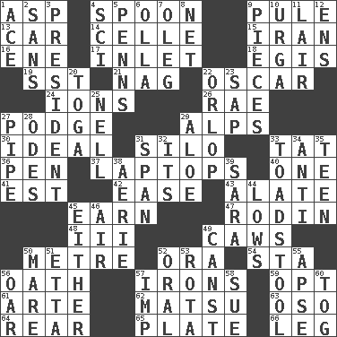 ACROSS 1. Cleo's killer 4. Soup utensil 9. Whimper 13. Auto 14. Cell (Danish) 15. SW Asia republic 16. Compass dir. 17. An arm off of a larger body of water 18. Armor plate that protects the chest 19. Fast jet (abbr.) 21. Tired old horse 22. Motion picture award 24. Charged atoms 26. Actress Charlotte 27. Porridge 29. High mountains 30. Perfect 31. Grain storage tower 33. Make lace 36. Writing instrument 37. Portable computers 40. Single 41. Eastern Standard Time (abbr.) 42. Comfort 43. Having winglike extensions 45. Merit 47. "The Thinker" sculptor 48. One more than two 49. Crow sounds 50. Distance measurement (Brit.) 52. Mouth or opening 54. R.R. building 56. Pledge 57. Metal shackles 59. Elect 61. Johnson of "Laugh-In" 62. Taiwanese island in East China Sea 63. Bear (Spanish) 64. Bring up, as a child 65. Food holder 66. Part of a journey DOWN 1. Adept person 2. Without 3. Elected leader of a country 4. _-fi 5. Actor Sean's family 6. Rounded earthenware pot or jar 7. Cassini of fashion 8. Remaining after all deductions 9. Components 10. Capital and largest city of Mongolia 11. Den 12. Followers of ems 20. Ancient Roman robe 22. Lowest deck of a ship 23. Plant excrement 25. 1994 drama film starring Jodie Foster 27. Corncob 28. Lyric poems 29. _ vera 31. Connect, as a bridge 32. It is 33. Inedible or poisonous agaric 34. Against 35. Adolescent 38. Nest on high 39. "Two Mules for Sister ____" 44. Moos 45. One or the other of two 46. Atmosphere 49. 2nd pers. sing. pres. of can (arch.) 50. Female horse 51. Singer James 52. Of the mouth 53. Roll call or roster of names 55. Domed church section 56. Boat paddle 57. Mischievous child 58. Institute legal proceedings 60. Coat; cloak