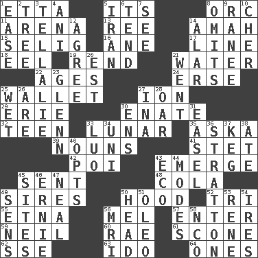 ACROSS 1. Singer James 5. It is 8. The grampus (Milton) 11. Sports stadium 13. Portuguese money of account (variant) 14. Nursemaid 15. Major League Baseball Commissioner Bud 16. One (Scot) 17. Actor's bit 18. Snakelike fish 19. Tear apart 21. Wetness 22. Grows older 24. Celtic language 25. Place for singles 27. Electrically charged atom 29. One of the Great Lakes 30. Related on the mother's side 32. Adolescent 33. Type of eclipse 35. "____ silly question..." 39. Parts of speech 41. Proofreading order 42. Luau course 43. Develop 45. Transmitted 48. Root beer relative 49. Founders of families 50. Parka part 52. Three (prefix) 55. Inactive volcano in Sicily 56. Cartoonist voice _ Blanc 57. Keyboard key 59. Famous astronaut Armstrong 60. Actress Charlotte 61. Biscuitlike quick bread 62. Compass dir. 63. Wedding promise 64. Washington bills DOWN 1. Comfort 2. Family _ (genealogy) 3. Copy Pinocchio 4. Cuckoo 5. SW Asia republic 6. Watch over 7. Observe 8. Leaves out 9. Indian princess (variant) 10. "Mermaids" star 12. Match 14. Having or resembling wings 20. Eastern Standard Time (abbr.) 21. Left 23. American astronaut and politician John 25. Dripping 26. "We ___ not amused" (Victoria) 27. _ tizzy (2 wds.) 28. Rowing implement 30. Followers of ems 31. Artist's stand 33. Nilotic language 34. Single; one (prefix) 36. Ski resort town in Vermont 37. Barrel 38. Had dinner 40. Chooses 43. Environmental prefix 44. Methods 45. Settings 46. Bert's buddy 47. Actress Patricia 49. Elected reps. 50. Froth on beer 51. Butter sub 53. French philosopher Descartes 54. Angers 56. Medical imaging device (abbr.) 58. Non-commissioned officer (abbr.)