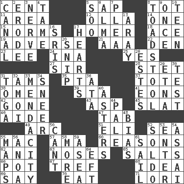 ACROSS 1. Penny 5. Plant excrement 8. Small child 11. Length times width 12. Spanish pot 14. Single 15. Typical models 17. Homing pigeon 18. Adept person 19. Contrary to your interests or welfare 21. Auto club (abbr.) 22. Lair 23. Area sheltered from the wind 24. _ tizzy (2 wds.) 25. It is so 27. Title for a knight 28. Proofreading order 31. Scottish caps 35. Parent Teacher Association (abbr.) 37. Lug 38. Sign of things to come 39. R.R. building 41. Immeasurably long periods of time 42. Went 43. Viper 45. Narrow board 46. Assistant 47. Bar bill 49. Curve 51. Biblical high priest 52. Ocean 55. Big _ 57. Wet nurse (var.) 60. Thinks logically 62. Cuckoo 63. Olfactory organs 65. Table seasonings 66. Plant holder 67. Not kosher 68. The content of cognition 69. Declare 70. Erode 71. Australian parrot (variant) DOWN 1. Lessep's creation 2. Wear away 3. Boldness 4. Docile 5. "Barney Miller" actor Jack 6. _ mater 7. Entreaty 8. Inedible or poisonous agaric 9. At one time in the past 10. Adolescent 13. Like ___ of sunshine 16. Indian titles of respect 17. Centers 20. Sever or remove by pinching or nipping 26. _____ Park, CO 29. Inactive volcano in Sicily 30. Trial 31. Ancient Roman robe 32. Mine, in Marseilles 33. Ananias' fault 34. Contemptuous expression 36. _ moment's notice (2 wds.) 40. Michaelmas daisies 44. Light colored 48. Prejudice 50. Patter 52. Twentieth part of a lira 53. Keyboard key 54. Slender Brazilian palm 55. Atlas contents 56. Small Philippine buffalo 58. Greater amount 59. Toward the sea 61. Move on water 64. Newt