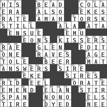 ACROSS 1. Part of HMS, perhaps 4. Necklace unit 8. Root beer relative 12. Epoch 13. In addition 14. Supplements with great effort 15. Pace 17. Housemaid 18. Cod relative 19. Not moving 21. According to 23. "One Day ___ Time" 24. Follow as a consequence or result 26. Australian flightless bird 28. Immeasurably long periods of time 30. Smoochers 34. Actress Charlotte 37. Small, secluded valley 39. Prepare for publication 40. Single 41. All-night dance parties 43. Grow older 44. Lacquered or enameled metalware 46. Fermented drink made from hops 47. Floor protector 48. Replies (to) 51. Father 54. Supplement with great effort 55. Founders of families 58. To free from 61. Snakelike fish 63. Speak pompously 65. Make improvements or corrections to 67. Enthusiasm 71. Move through with a circular motion 72. Connect, as a bridge 73. Words to Nanette 74. Raised railways 75. Hoop that covers a wheel 76. Colored 77. Born DOWN 1. Possessive pronoun 2. Feeling or showing extreme anger 3. Smooth fabric 4. Sound made by sheep 5. Shade tree 6. White ___ sheet 7. Capital of the state of Qatar 8. Corporate head (abbr.) 9. Gumbo ingredient 10. For fear that 11. "____ silly question..." 16. Otherwise 18. Scottish caps 20. Nilotic language 22. Flowery wreath 25. Engineer (abbr.) 27. Purpose 29. Thick slices 30. Leg joints 31. Dutch treat 32. Capital of Latvia 33. Proofreading order 34. Round or rotation of duties 35. Soon (poet.) 36. Snakelike fish 38. First lady 42. Indian titles of respect 45. She-sheep 49. Supplemented with great effort 50. To riddle 52. _ de Janeiro 53. Blunders 56. Consumed 57. Vertical member of a panel or frame 58. Repose 59. Body of Kaffir warriors 60. Letter starter 62. Grant temporary use of 64. Celtic language 66. Compass dir. 68. Myrna of the movies 69. One (Scot) 70. Dreamland