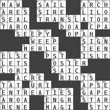ACROSS 1. Informal term for the mouth 4. Travel by water 8. Bowlike part 12. Ancient Greek god of war 14. Beget 15. _ and Stitch 16. Lick closed 17. Interpreter 20. Pacific island yam 21. ___ good deed 22. Accounting whiz (abbr.) 23. Not well drained, as in land 27. Brightly colored fish 29. Shed a tear 31. Signal 34. Haggard of country music 35. Adolescent 36. Otherwise 39. Pacific Standard Time (abbr.) 41. Capri or Wight 42. Allows 43. Flexible twig of a willow tree 46. Australian parrot (variant) 47. Ketch in the Levant 48. Measure of real estate 51. Debaucheries 54. Make lace 56. RI univ. 58. Domed church section 61. Pleas 66. Yawn 67. Small Philippine buffalo 68. Engineer (abbr.) 69. Play the lead 70. French philosopher Descartes 71. Wise men 72. Filthy place DOWN 1. Vertical spar for supporting sails 2. Length times width 3. Puts on (as clothing) 4. Fast jet (abbr.) 5. Wind 6. Retirement account (abbr.) 7. Grant temporary use of 8. In the manner of 9. Actors Guy, Robert Welles, and Clint 10. Hoof sound 11. Israeli folk dance 13. _ gin 18. "Barney Miller" actor Jack 19. Pet locale 24. She-sheep 25. For each 26. Sharp bark 28. Moving about 30. Mexican monetary units 32. Set 33. Compass dir. 34. Mesonic 36. Pipe bend 37. Lion 38. Ski resort town in Vermont 40. Russian ruler of old 44. One more than two 45. Environmental prefix 49. Regret 50. Period 52. Labels 53. Arguments over trivial matters 54. Rend 55. Singer Murray 57. A whole individual unit 59. Petty quarrel 60. Suggestive of the supernatural 62. Actress Charlotte 63. _ tizzy (2 wds.) 64. Ovum 65. _ Lanka