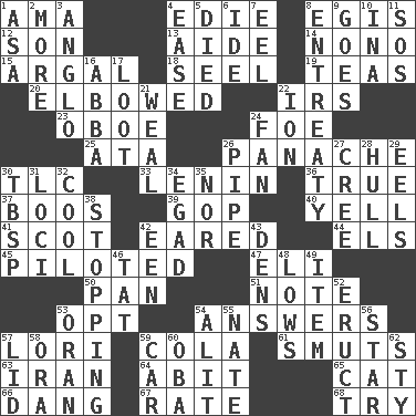 ACROSS 1. Housemaid (var.) 4. Singer Brickell 8. The front part of a cuirass 12. Male child 13. Assistant 14. Words to Nanette 15. Therefore, facetiously 18. Sew up the eyelids of hawks and falcons 19. Beverages made from leaves 20. Turned at an angle; bent 22. Big collection agency 23. Mitch Miller's instrument 24. Enemy 25. "One Day ___ Time" 26. Flamboyance 30. Affectionate concern, for short 33. Soviet premier 1918-24 36. Loyal 37. Scornful sounds 39. Grand Old Party 40. Shout 41. Native of Scotland 42. Having ears or earlike features 44. Raised railways 45. Manned the helm 47. Connecticut Ivy Leaguer 50. Baking dish 51. Short letter 53. Elect 54. Responses 57. Australian parrot (variant) 59. Root beer relative 61. Particles of soot 63. SW Asia republic 64. "This won't hurt ____!" 65. Domesticated feline 66. Mild oath, euphamism for damn 67. Assign a rank or rating to 68. Attempt to accomplish something DOWN 1. White ___ sheet 2. Greater amount 3. White American of non-Hispanic descent 4. Comfort 5. Passed on 6. Binary compound 7. Snakelike fish 8. Plea 9. Travels 10. _ tizzy (2 wds.) 11. Distress signal 16. Swedish rock group 17. Plunder 21. Welt 22. Electrically charged atom 24. Air blower 26. Corncob 27. Algonquian 28. Frame or body of a ship 29. Snakelike fish 30. Cook's measure (abbr.) 31. Venues 32. Calm and collected 34. Mild oath 35. Not either 38. Ceasing 42. Car or cant ending 43. Habitations of wild animals 46. Make lace 48. Coldest temperatures 49. Detail 52. Spew [out] 53. NW Algerian seaport 54. Set down 55. Nathan's nickname 56. Play the lead 57. Hat (slang) 58. Mouth or opening 59. 4-wheeled motor vehicle 60. Chief or king in Benin or Nigeria 62. Filthy place