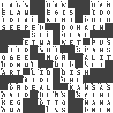 ACROSS 1. Falls behind 5. Simpleton 8. One of the 12 tribes of Israel 11. Style 12. Armor plate that protects the chest 14. Wedding promise 15. "_____ Recall" 17. Left 18. Wrote a lyric poem 19. Oozed 21. Realm 23. Perceive with the eye 25. Norwegian king 26. Inactive volcano in Sicily 27. Dripping 28. Product of festering 31. It would 33. Indian title of respect (Mr.) 35. Connects, as a bridge 37. Double curve, resembling the letter S 38. Not either 40. Came down and settled, as after flight 41. Child's nurse 43. Modern: prefix 45. Put into a specified state 46. Tate display 47. Flaplike covering 50. Food container 52. Helper 53. Single 54. Severe or trying experience 56. Sunflower state 61. Enthusiastic 62. Cloth borders 65. Inhabitant of Heaven 66. Cask 67. Von Bismarck 68. Nanny 69. Santa ___, CA 70. Double-curved letter 71. Sign of things to come DOWN 1. Allows 2. _ vera 3. Yard entry 4. Fastener 5. Morning condensation 6. Ripen 7. Light entry point 8. "You Light Up My Life" star Conn 9. An important port of Yemen 10. Allow head to fall sleepily 13. Took without asking 16. For fear that 18. Clumsy lout 20. Habitations of wild animals 22. Floor coverings 24. Merit 26. Paradise 28. Diluted with white 29. A single undivided whole 30. Fast jet (abbr.) 31. Composer Stravinsky 32. Portable shelter 34. Electrically charged atom 36. Romantic infatuation 37. Chief or king in Benin or Nigeria 39. Do over again 42. Writer Wiesel 44. Pig sound 48. Potato state 49. Keyboard key 51. Oceans 52. Say or write further 54. Baking chamber 55. Port city in Latvia 57. Billionth: prefix 58. Thailand, formerly 59. Queen of England 1702-14 60. Comedian Laurel of Laurel & Hardy 61. Alias (abbr.) 63. Mountains (abbr.) 64. Mayday