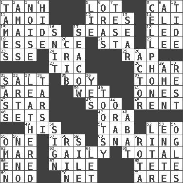 ACROSS 1. Hyperbolic tangent 5. Car dealer's back yard 8. Domesticated feline 11. Mine, in Marseilles 12. Angers 14. Connecticut Ivy Leaguer 15. Women servants 17. Gospel singer Marvin 18. Directed 19. Gist 21. R.R. building 22. Area sheltered from the wind 23. Compass dir. 24. Lyricist Gershwin 25. Reproach for some lapse or misdeed 27. Nervous spasm 28. Burn to charcoal 31. Table seasoning 35. Male child 37. Heavy book 38. Type of rug 39. Soggy 41. Washington bills 42. Play the lead 43. "Barney Miller" actor Jack 45. Monthly bill 46. Arranges properly for use 47. Mouth or opening 49. Part of HMS, perhaps 51. Bar bill 52. Lion 55. Single 57. Big collection agency 60. Catching in a trap 62. Spoil 63. Lightheartedly 65. Add up to 66. Compass dir. 67. "Death on the ____" 68. False hair 69. Dreamland 70. Fish or hair follower 71. Ancient Greek god of war DOWN 1. Domesticates 2. Collect or gather 3. Annoying sound 4. Flintstone garb 5. Falsehood 6. Mouths or openings 7. Trial 8. Portable communications device 9. Toward shelter 10. Event that recurs at intervals 13. Wither 16. In a ____ (agitated or irritated) 17. Manatee 20. Baby bed with high sides 26. Thespian 29. So be it 30. Respite 31. Backtalk 32. Johnson of "Laugh-In" 33. Resembling or made to resemble leather 34. Tarsus (plural) 36. Consenting reply 40. Tootsie (variant) 44. Northwest Algerian city 48. Blind as ____ 50. Omen 52. 61 cubic inches 53. Maternal 54. Stares at amorously 55. Sign of things to come 56. Billionth: prefix 58. Water falling in drops from the sky 59. Filth; sediment 61. Round or rotation of duties 64. Allow