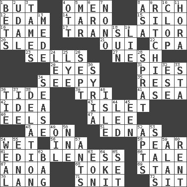 ACROSS 1. Yet 4. Sign of something about to happen 8. Bowlike part 12. Dutch treat 14. Edible starchy tuberous root 15. Grain storage tower 16. Docile 17. Interpreter 20. Downhill vehicle 21. Fr. "Yes" 22. Numbers guy (abbr.) 23. Makes a sale 27. Soft 29. Snake ____ (dice throw) 31. Sliced desserts 34. Oozy 35. Remainder 36. Periodic rise and fall of the sea level 39. Three (prefix) 41. Toward the sea 42. It may be bright or harebrained 43. Small island 46. Snakelike fish 47. Toward shelter 48. Period of immesurable duration 51. Ferber et al. 54. Dripping 56. _ tizzy (2 wds.) 58. Lightbulb-shaped fruit 61. The property of being fit to eat 66. Falsehood 67. Small Philippine buffalo 68. Puff or smoke 69. Comedian Laurel of Laurel & Hardy 70. Long (Scottish) 71. In a ____ (agitated or irritated) 72. Be seated DOWN 1. Wagers 2. Freehold land 3. Softens 4. Baseball player Mel 5. Make imperfect 6. Epoch 7. Words to Nanette 8. White ___ sheet 9. Actors Guy, Robert Welles, and Clint 10. Hoof sound 11. Israeli folk dance 13. Ancient Persian 18. Player for Phoenix 19. Untruth 24. Area sheltered from the wind 25. Potassium hydroxide 26. Back-to-school mo. 28. Small fatty European fish 30. Damascus' land 32. Compass dir. 33. R.R. building 34. Gospel singer Marvin 36. Make a knot 37. Binary compound 38. Accusation by an informer 40. Small island 44. Directed 45. Car or cant ending 49. Petroleum 50. Compass dir. 52. Flats, for short 53. Theater features 54. Welt 55. Pulitzer Prize-winning author Ferber 57. Pismires 59. Jai ____ 60. Monthly bill 62. Container for groceries 63. A really long time 64. What Jean-Claude Killy likes to do 65. Put into a specified state